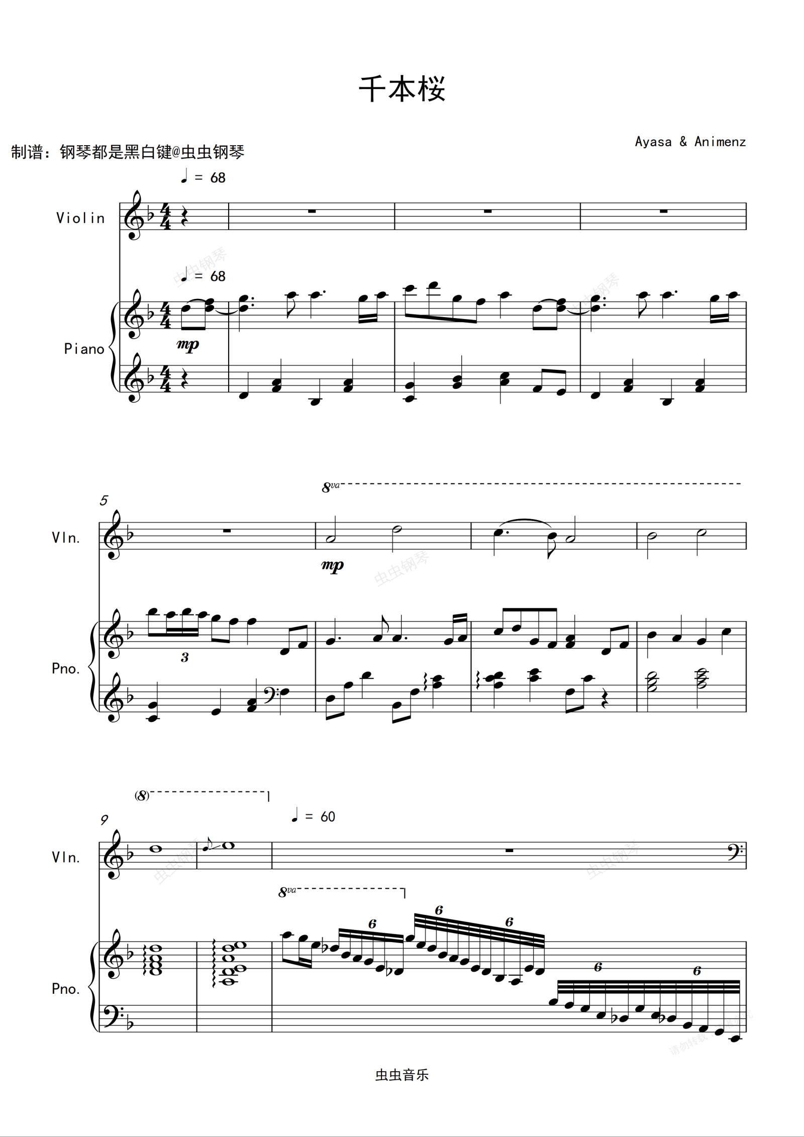 钢琴谱:【 Animenz】《千本樱》钢琴&小提琴)(爆燃演奏版)