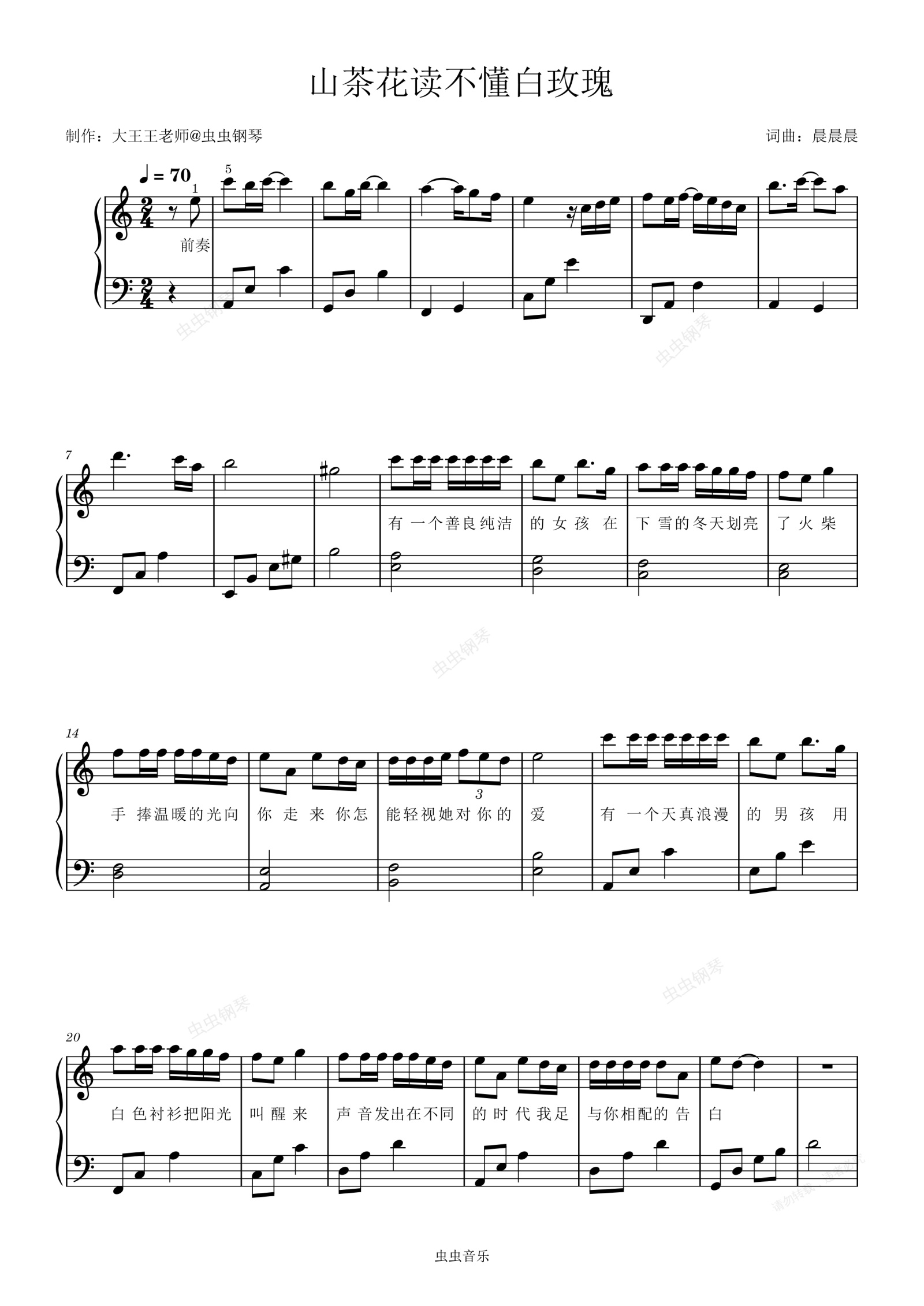 钢琴谱:山茶花读不懂白玫瑰带歌词C调
