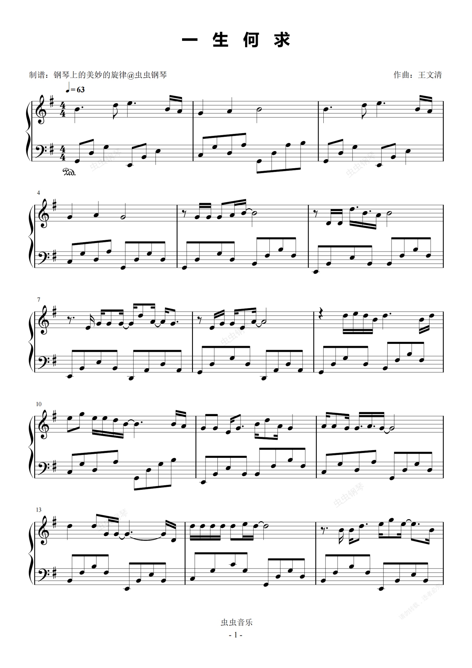 钢琴谱:一生何求 原调简易版 陈百强 粤语流行经典