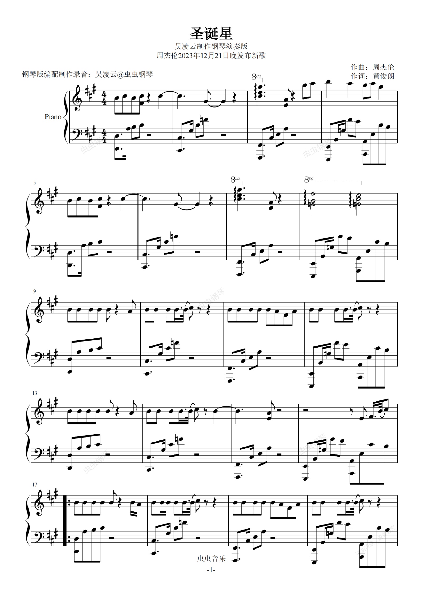 钢琴谱:圣诞星-周杰伦2023年12月21日晚发布新歌 吴凌云制作钢琴演奏版