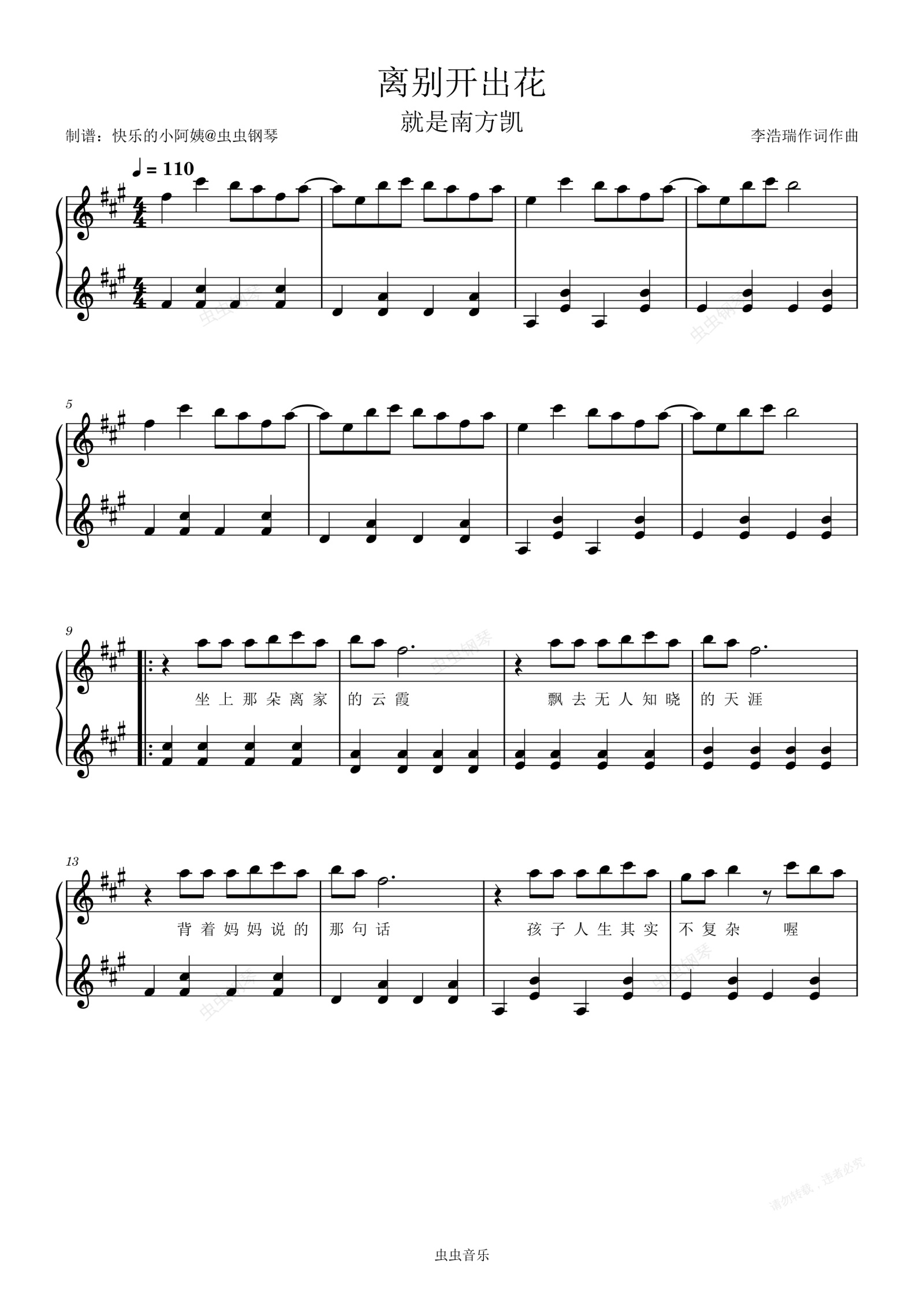 钢琴谱:离别开出花A大调带歌词就是南方凯