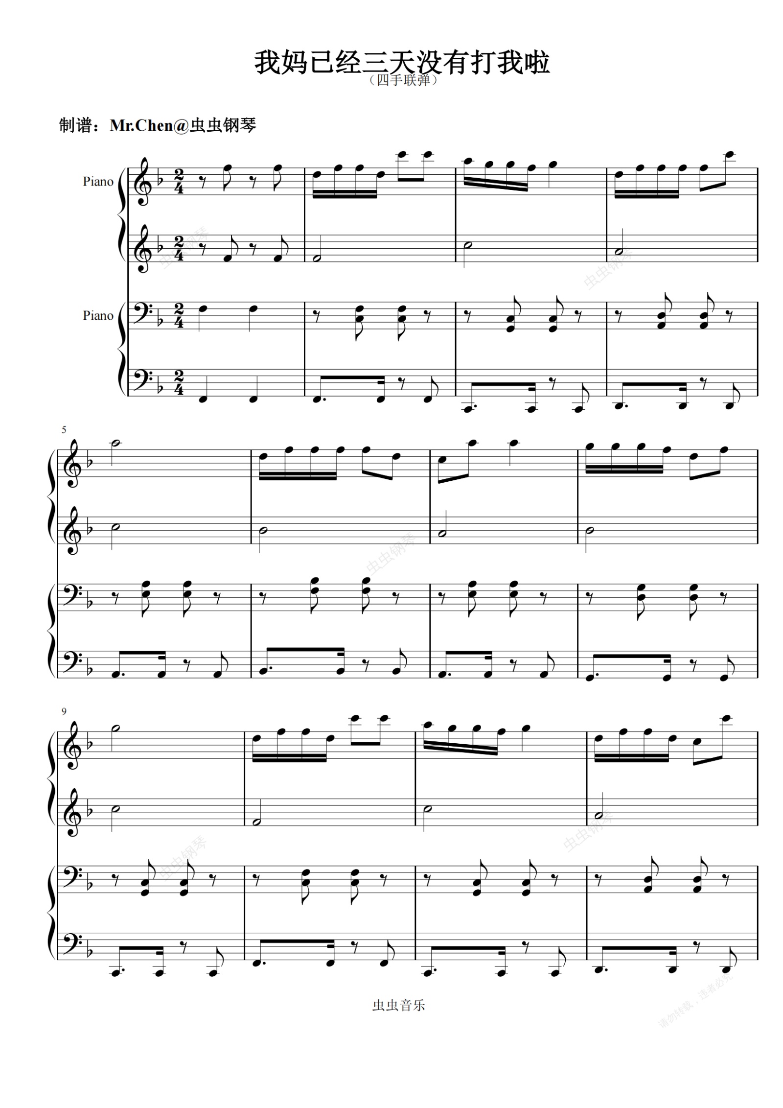 钢琴谱:【四手联弹】我妈已经三天没有打我啦-乔洋