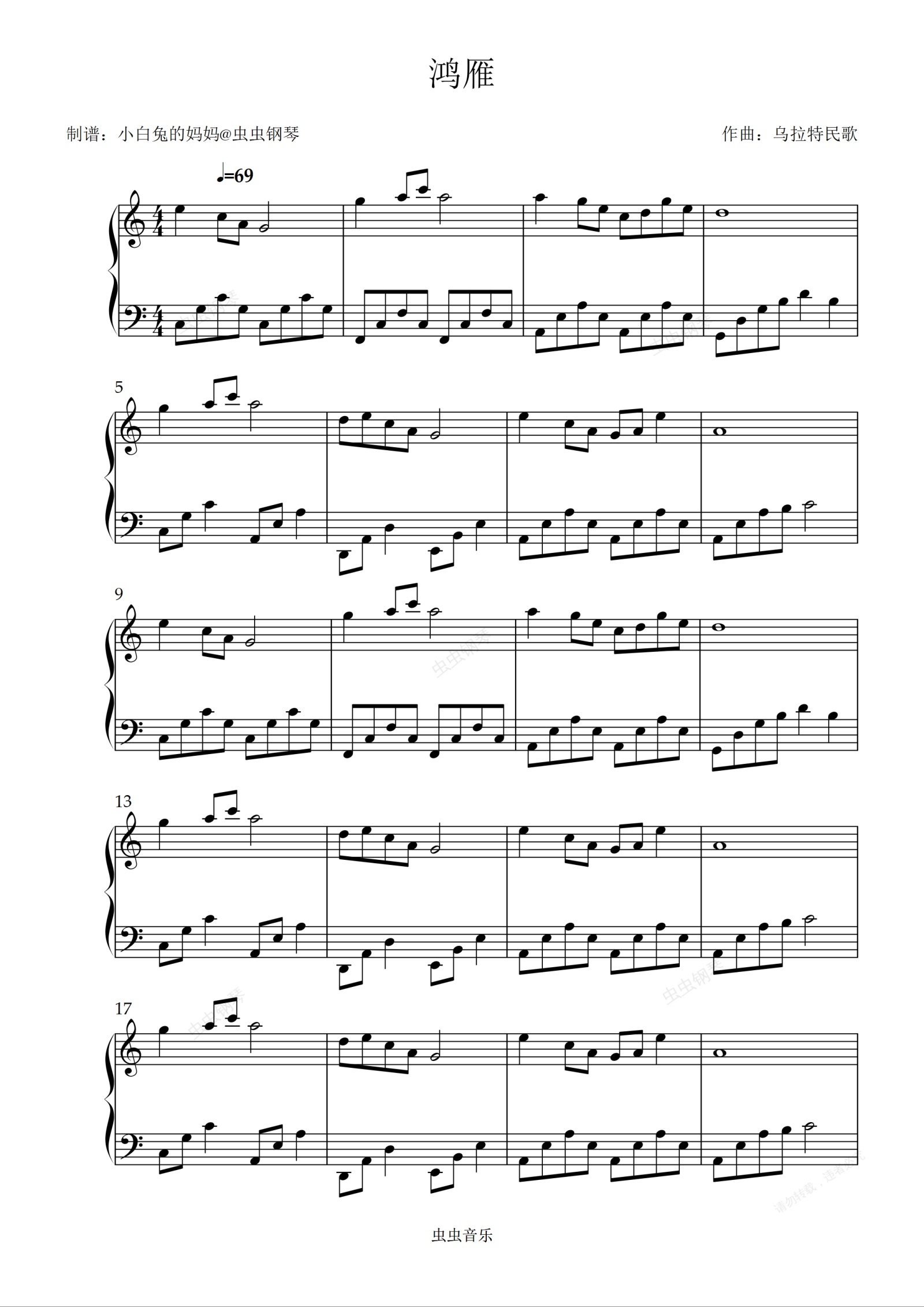 钢琴谱:鸿雁 C调 简单