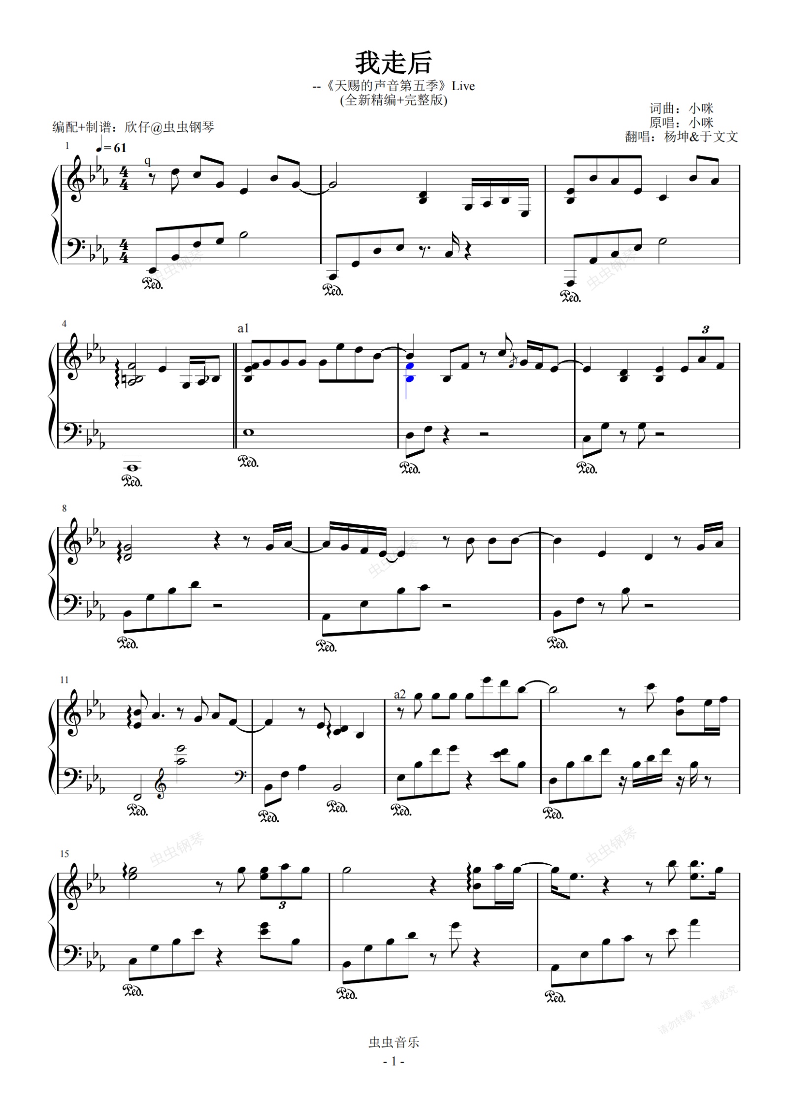 钢琴谱:降E转C-《我走后》(《天赐的声音第五季》live、杨坤&于文文、完整版)