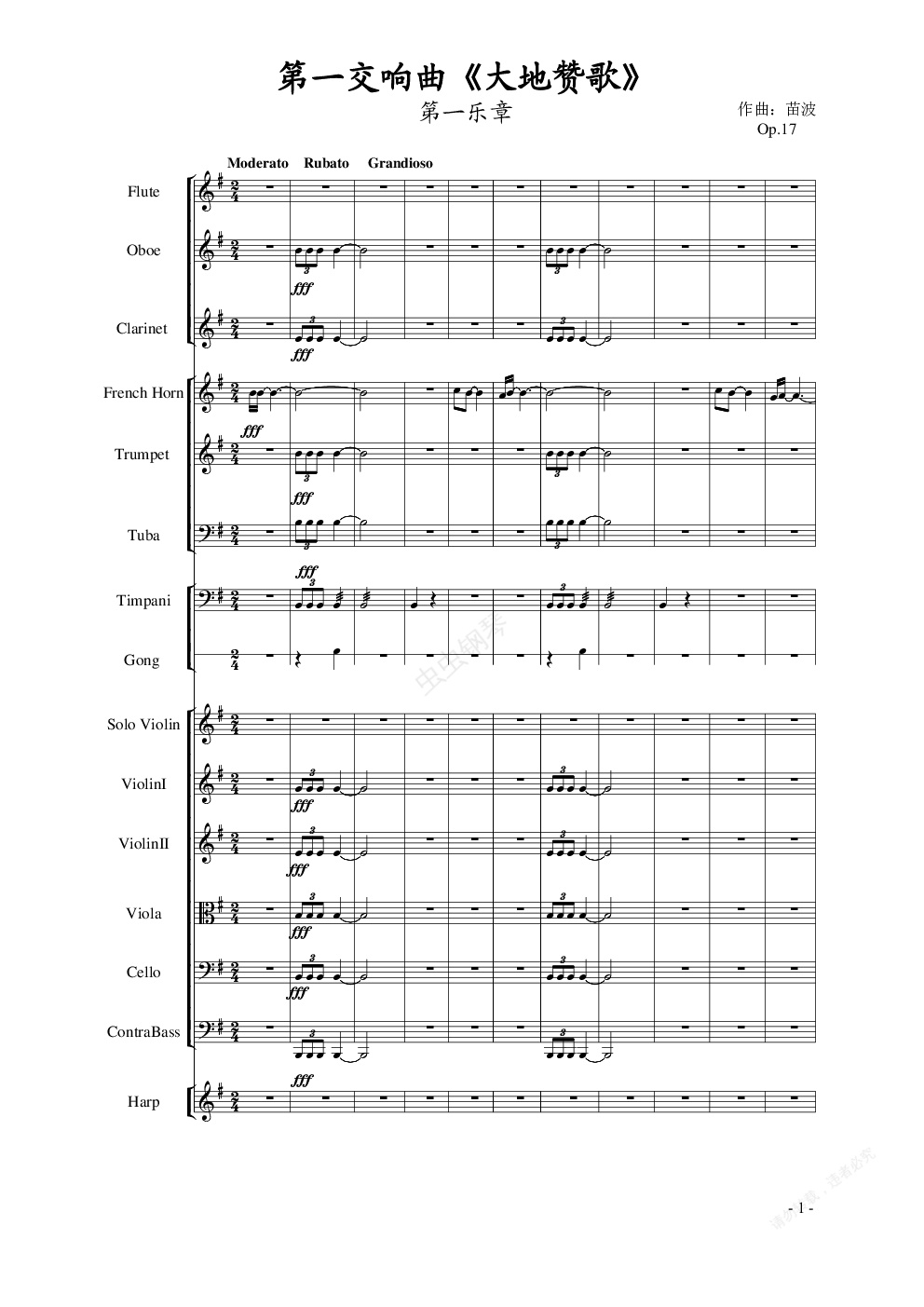 第一乐章开头由圆号引出,与管弦乐的三连音交替重奏体现了电闪雷鸣,大地形成之势,可以联想到盘古开天辟地。随后由首席小提琴和弦乐组演奏的第一主题主旋律描绘了幼苗发芽,万物萌生的场景,随着木管组,铜管组以及打击乐组的加入,逐渐展现了大地河山的壮美景象。乐曲中间部分为第一乐章的第二主题,运用了民族曲调,讲述了民族的起源、发展与繁盛,其段落后部带有宫廷音乐的色彩,让人联想到盛唐繁荣。第二主题过后再现第一主题,全曲进入高潮之后变为快板,由两个主题变奏而来,铿锵有力的节奏让我们看到了中国人勤劳勇敢,自强不息的民族精神。最后,乐曲恢复行板,在第一主题高亢的管弦乐齐奏中结束。