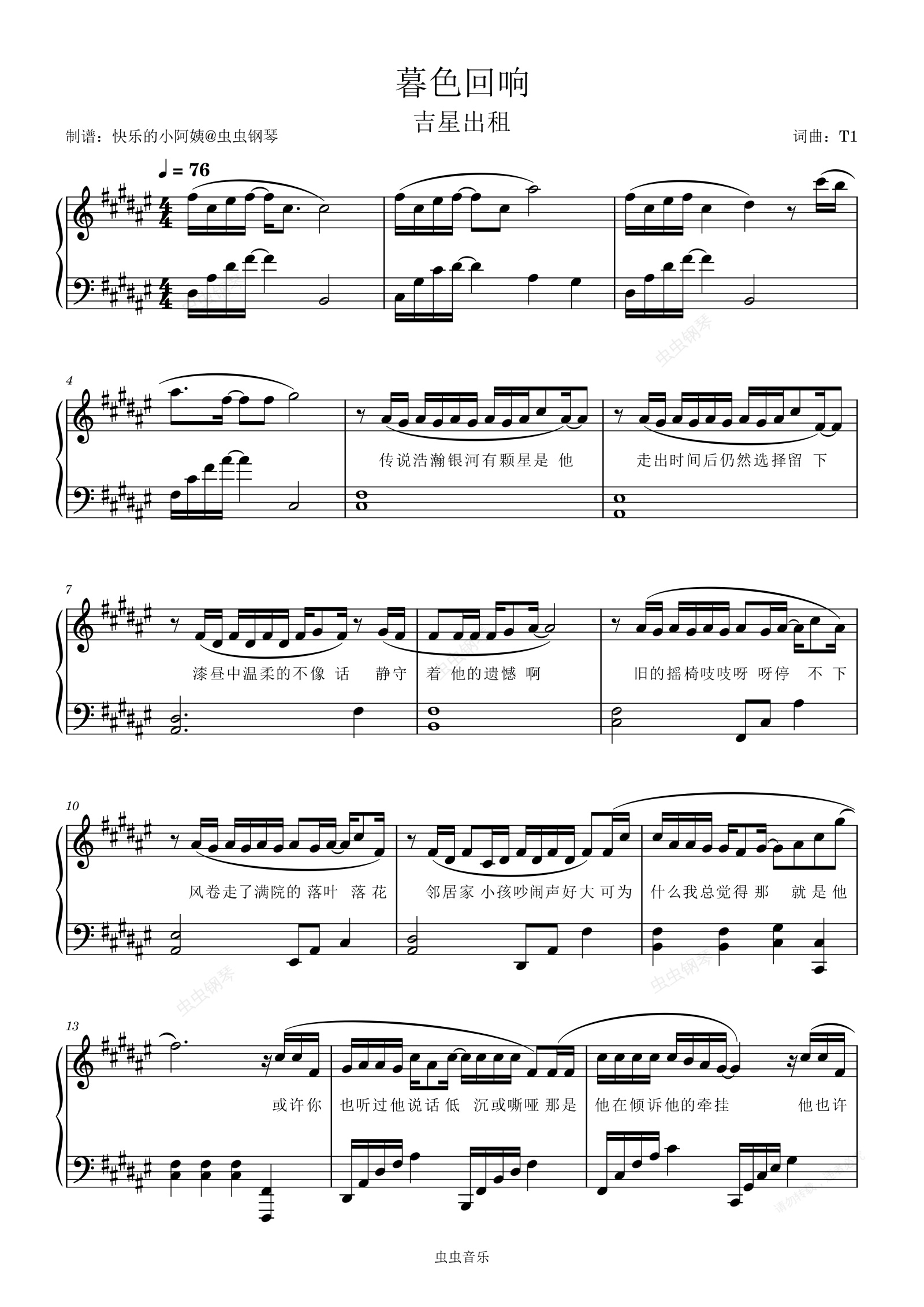 钢琴谱:暮色回响(带歌词完整版)吉星出租