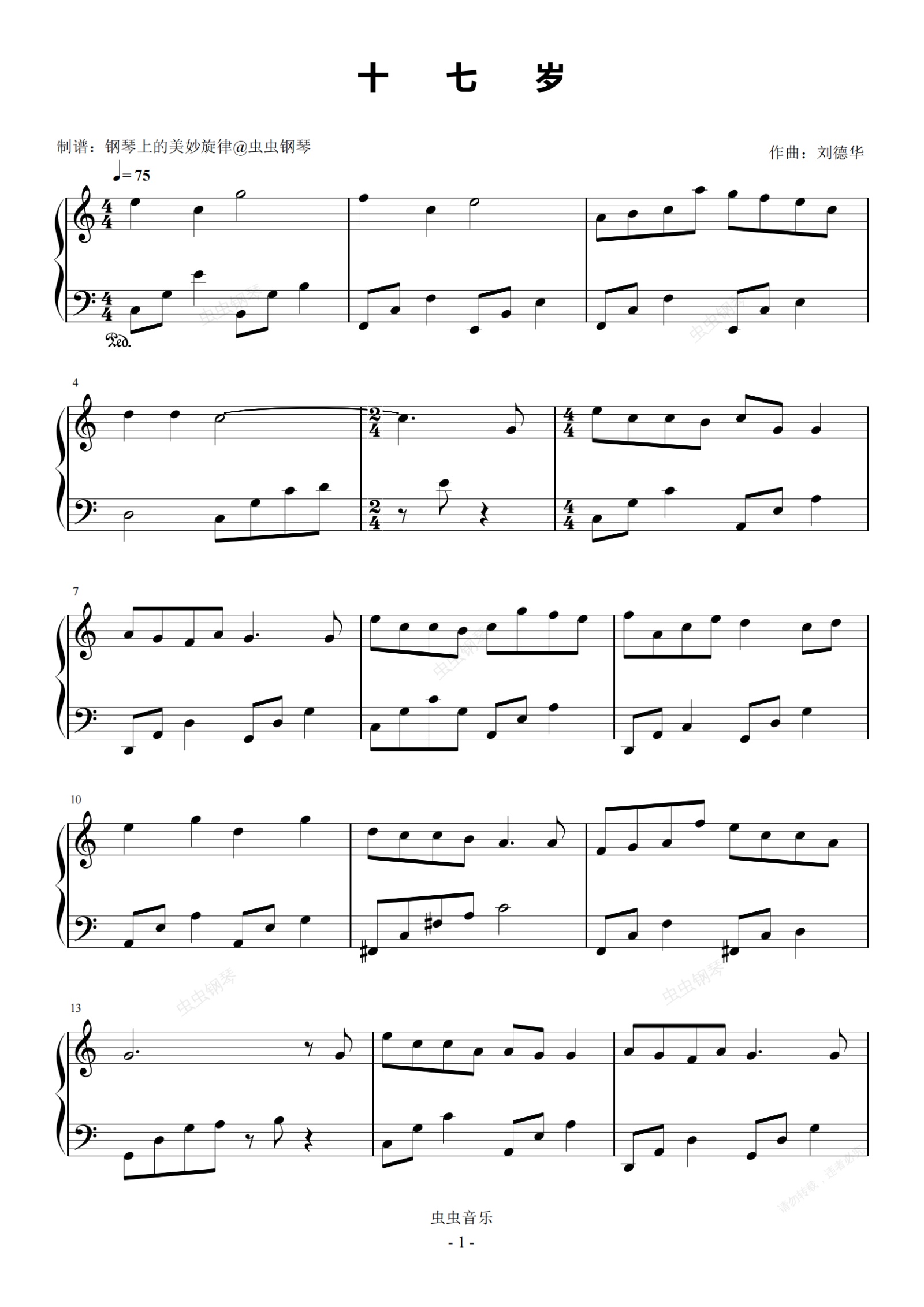 钢琴谱:十七岁 C调简易版 刘德华 流行经典