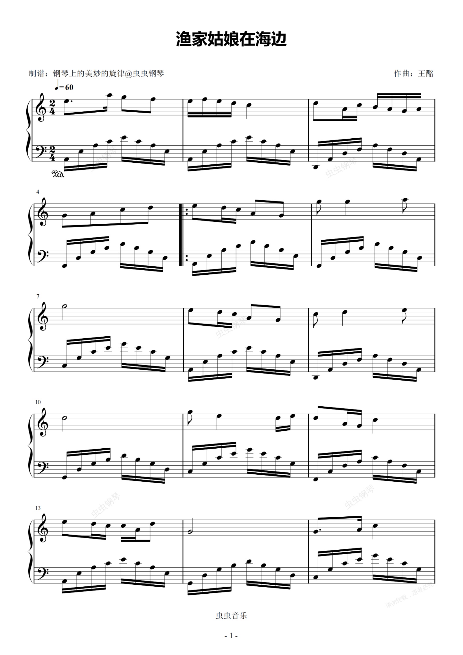 钢琴谱:渔家姑娘在海边 C调简易版 经典流行