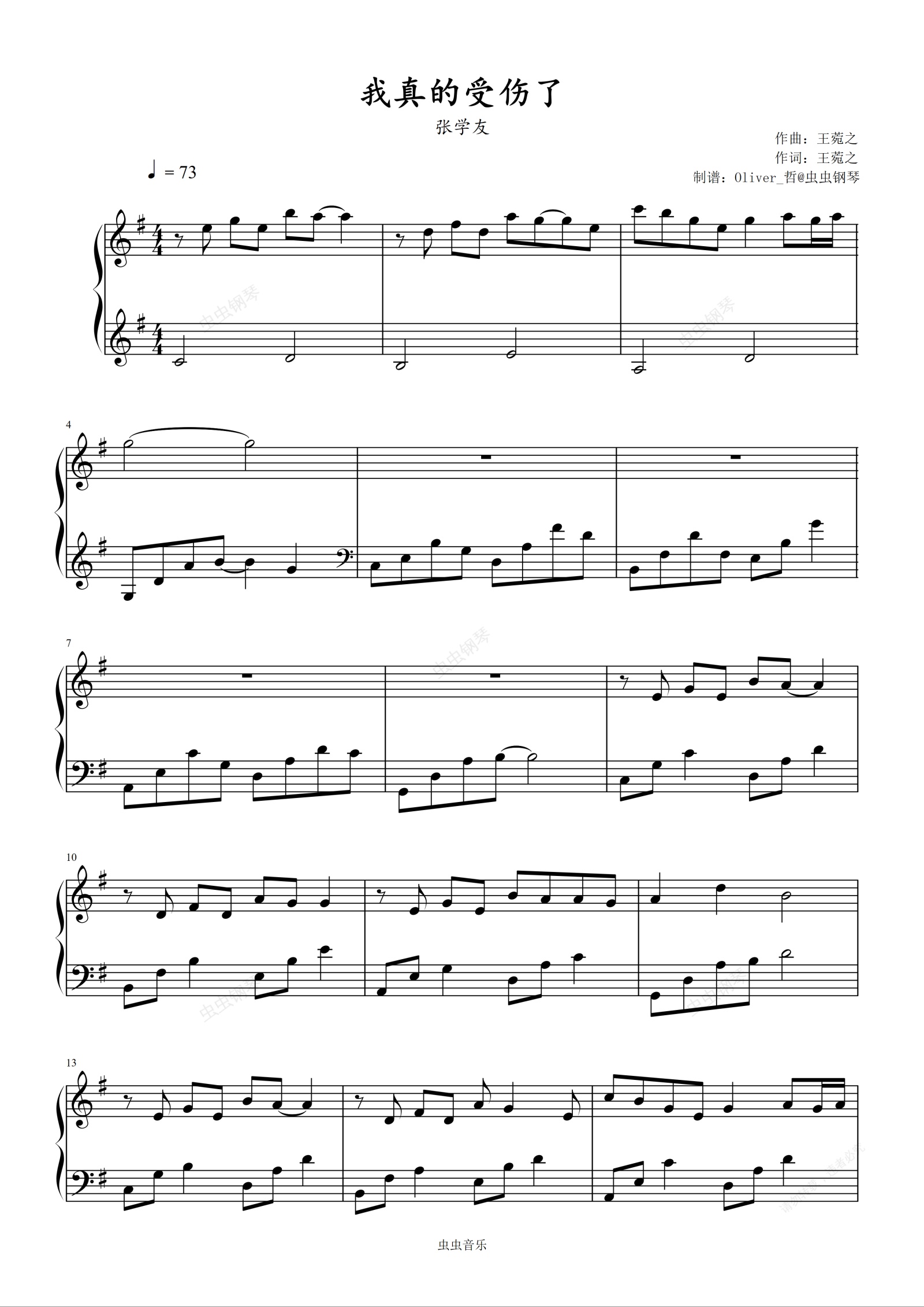 钢琴谱:我真的受伤了 原调精编简易版 张学友