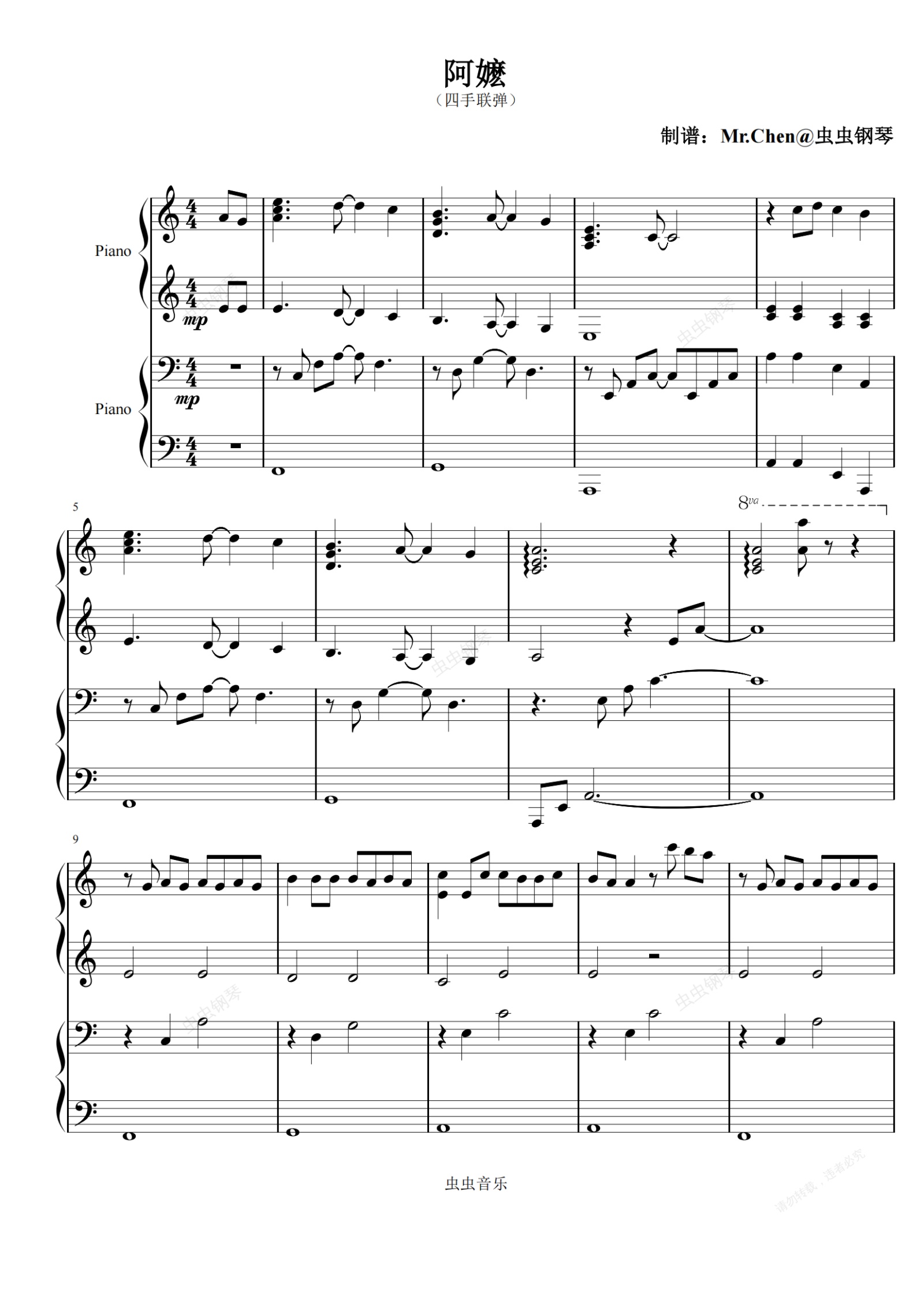 钢琴谱:阿嬷 (四手联弹)C调 -周林枫