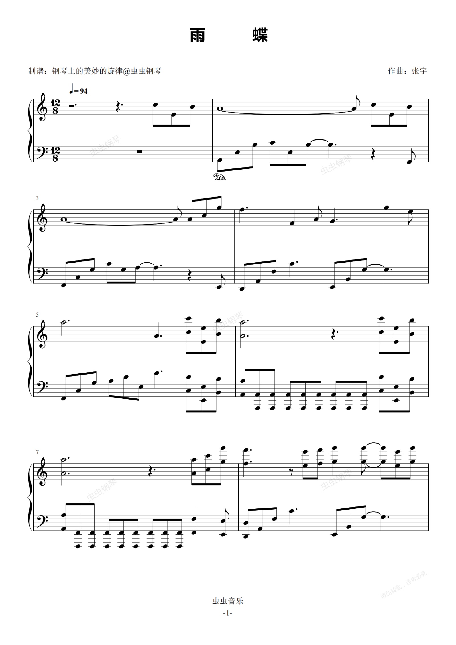 钢琴谱:雨蝶 C调简易钢琴弹唱 带歌词 李翊君 流行经典