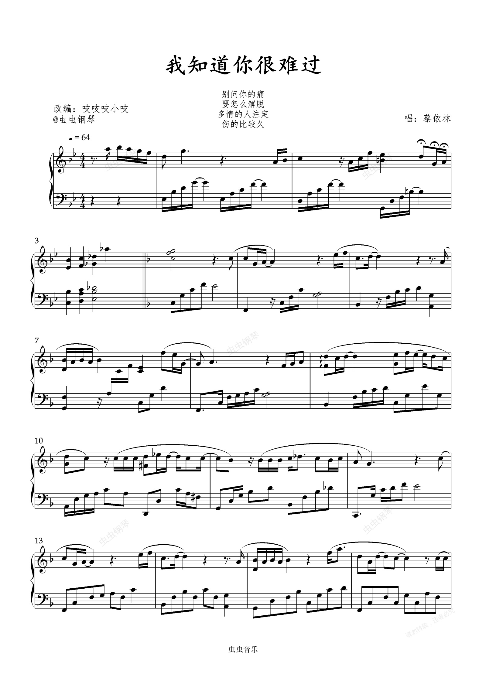 钢琴谱:我知道你很难过 「伤感」少调号 蔡依林 吱吱编配
