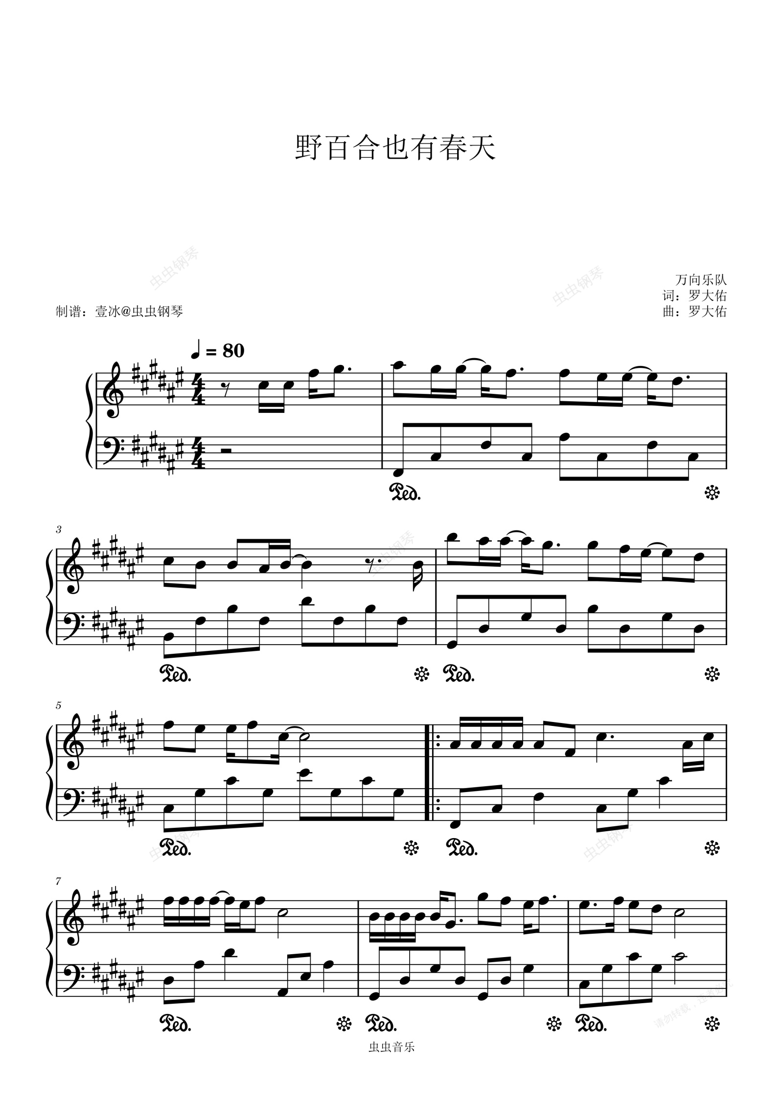 钢琴谱:野百合也有春天 (万向乐队版) 原调