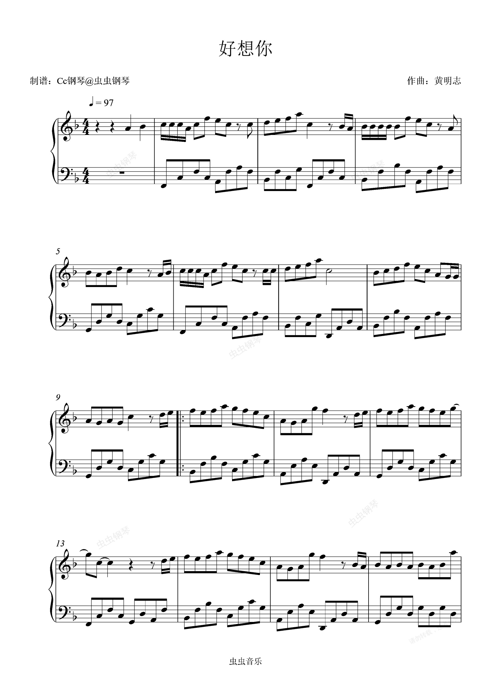 钢琴谱:好想你 F调 好听易上手