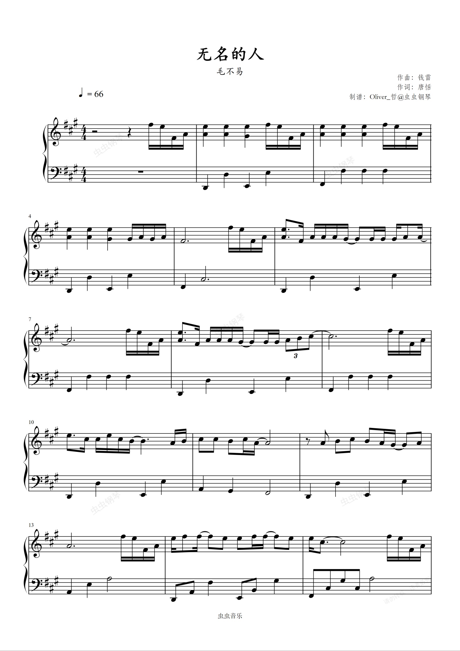 钢琴谱:无名的人-毛不易 原调精编简易版 网络热歌 新手易弹(电影《雄狮少年》主题曲)