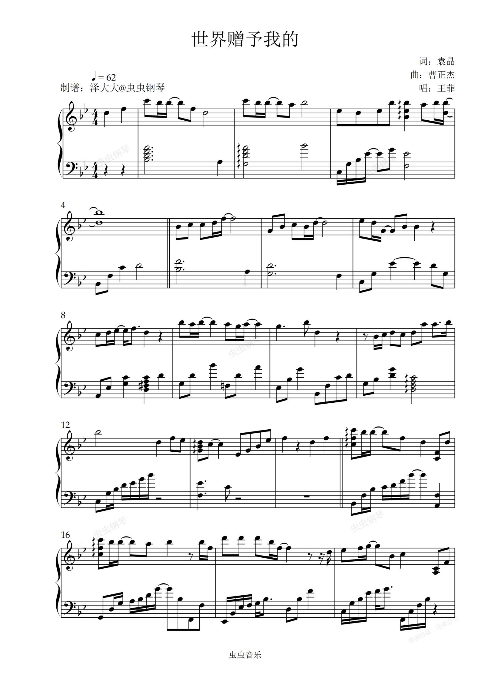 钢琴谱:世界赠予我的【钢琴独奏版】王菲 泽大大