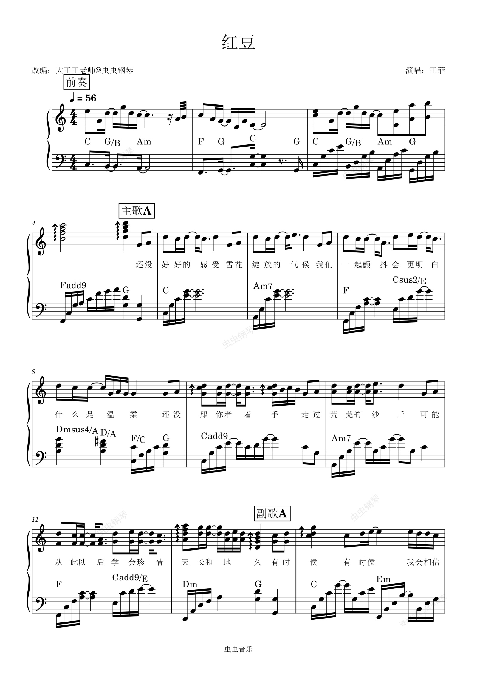 钢琴谱:红豆(带歌词和弦王菲精致版)