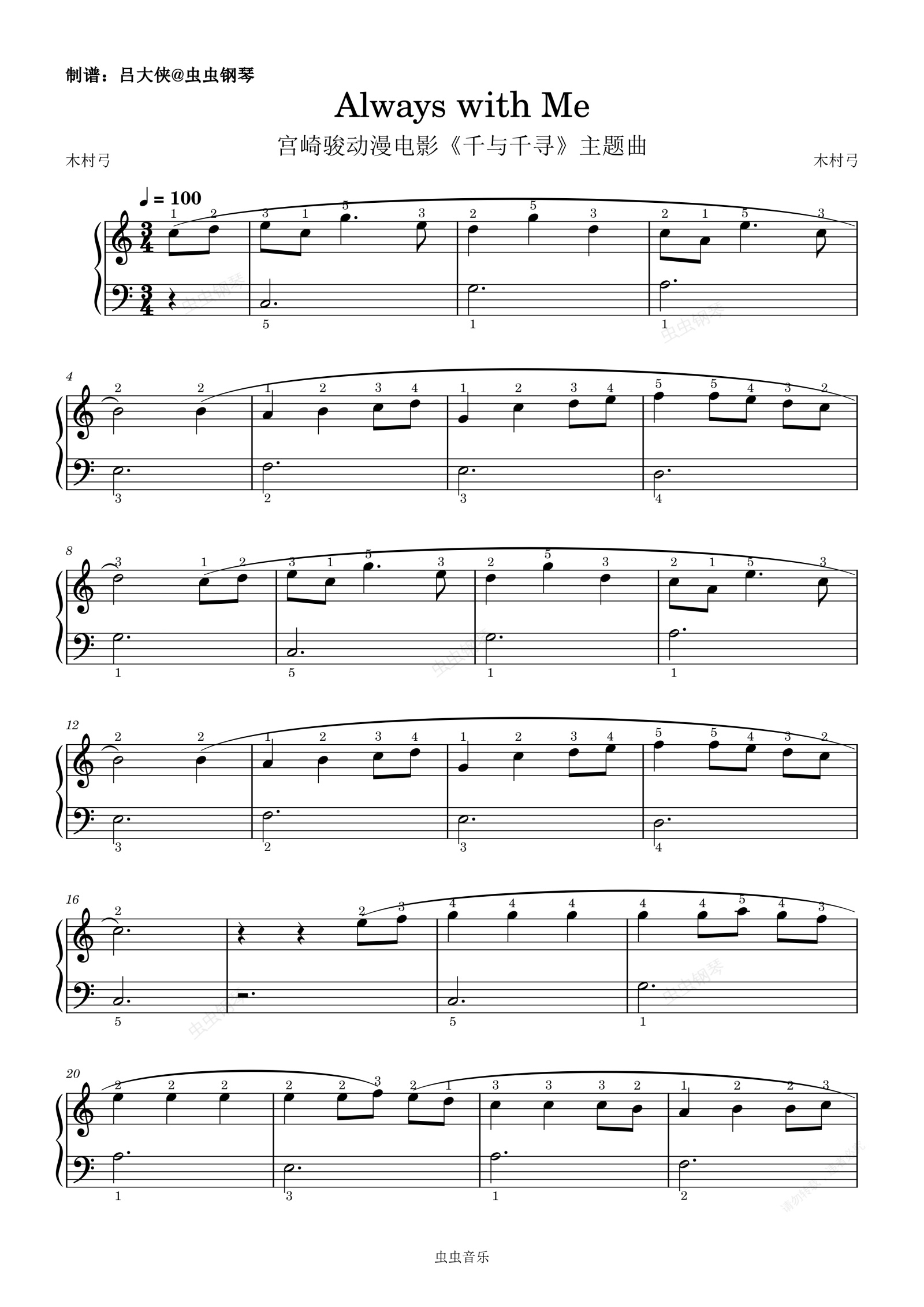 钢琴谱:宫崎骏电影《千与千寻》主题曲《Always With Me》