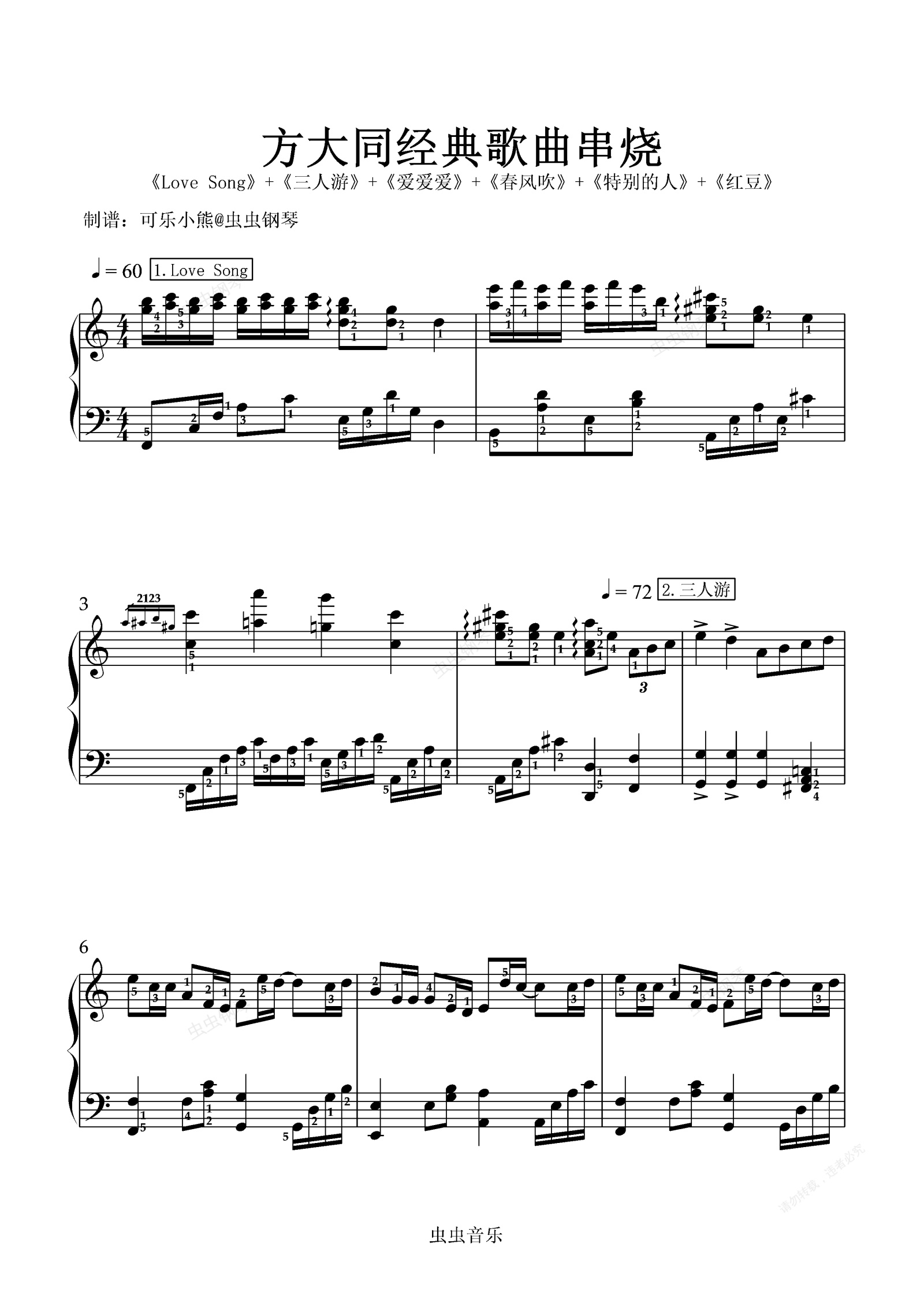 钢琴谱:《方大同经典歌曲串烧》C调+歌词+指法