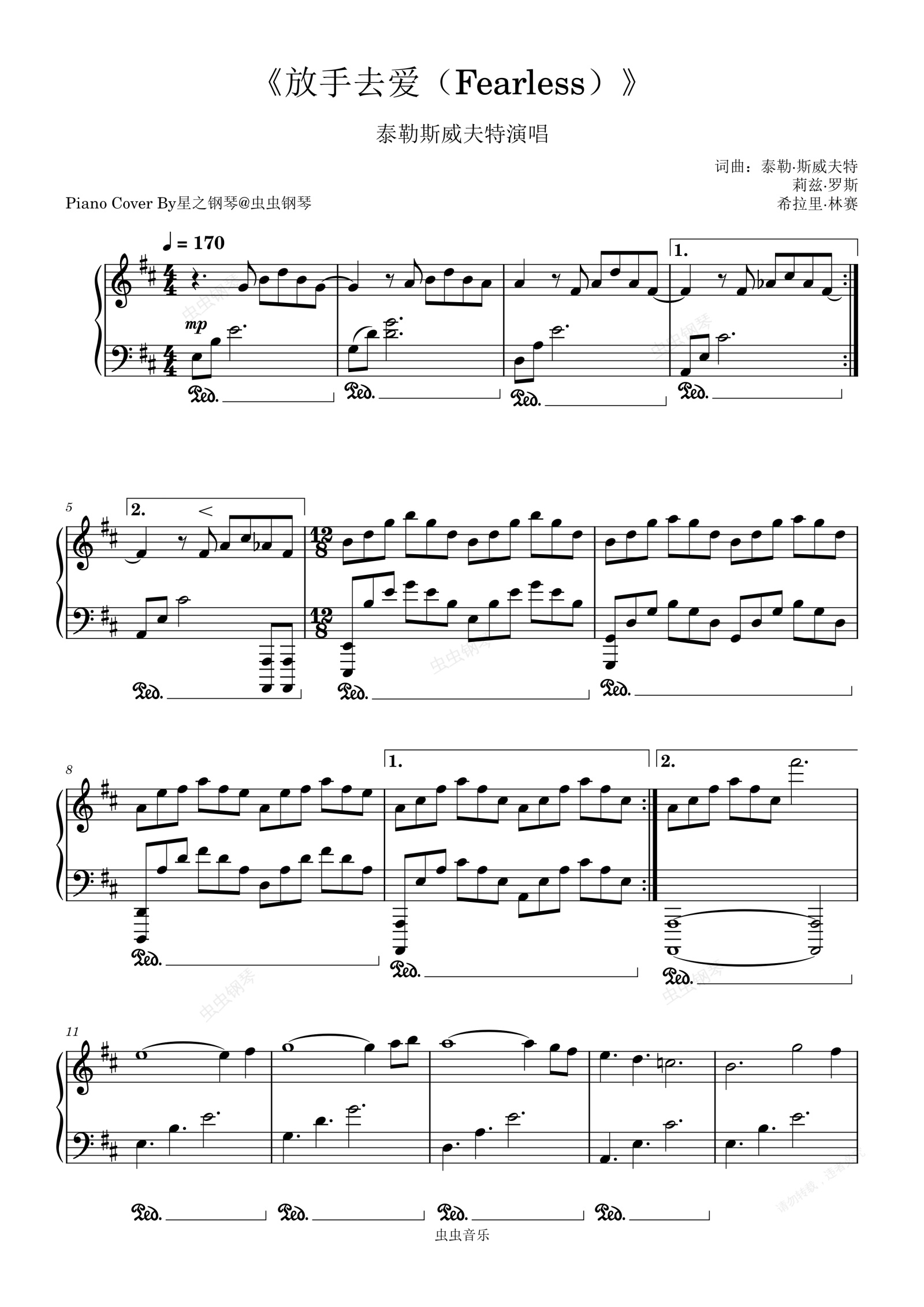 钢琴谱:泰勒斯维夫特《放手去爱Fearless》钢琴独奏版