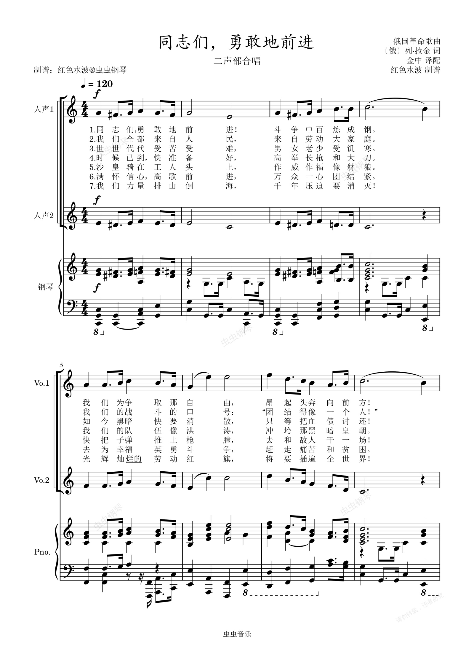 钢琴谱:同志们,勇敢地前进(二声部合唱)