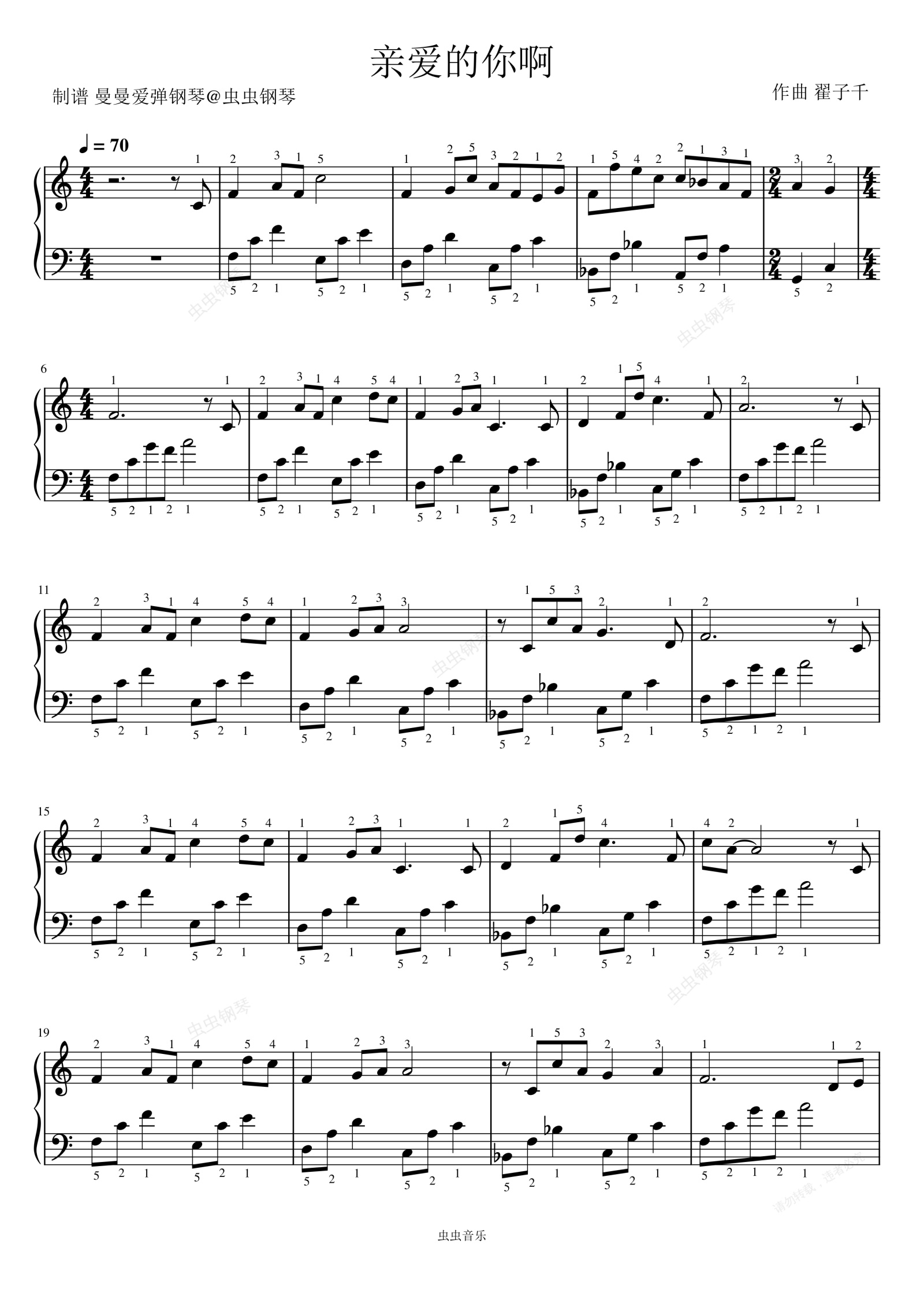 钢琴谱:《亲爱的你啊》F调 简易 好听 好弹