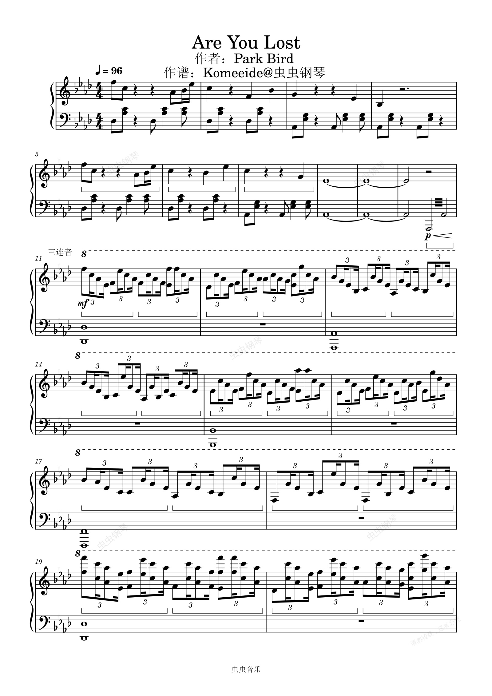 钢琴谱:钢琴 Are You Lost - Park Bird (Piano Solo)作谱:Komeeide Ab/f 五线谱 钢琴谱
