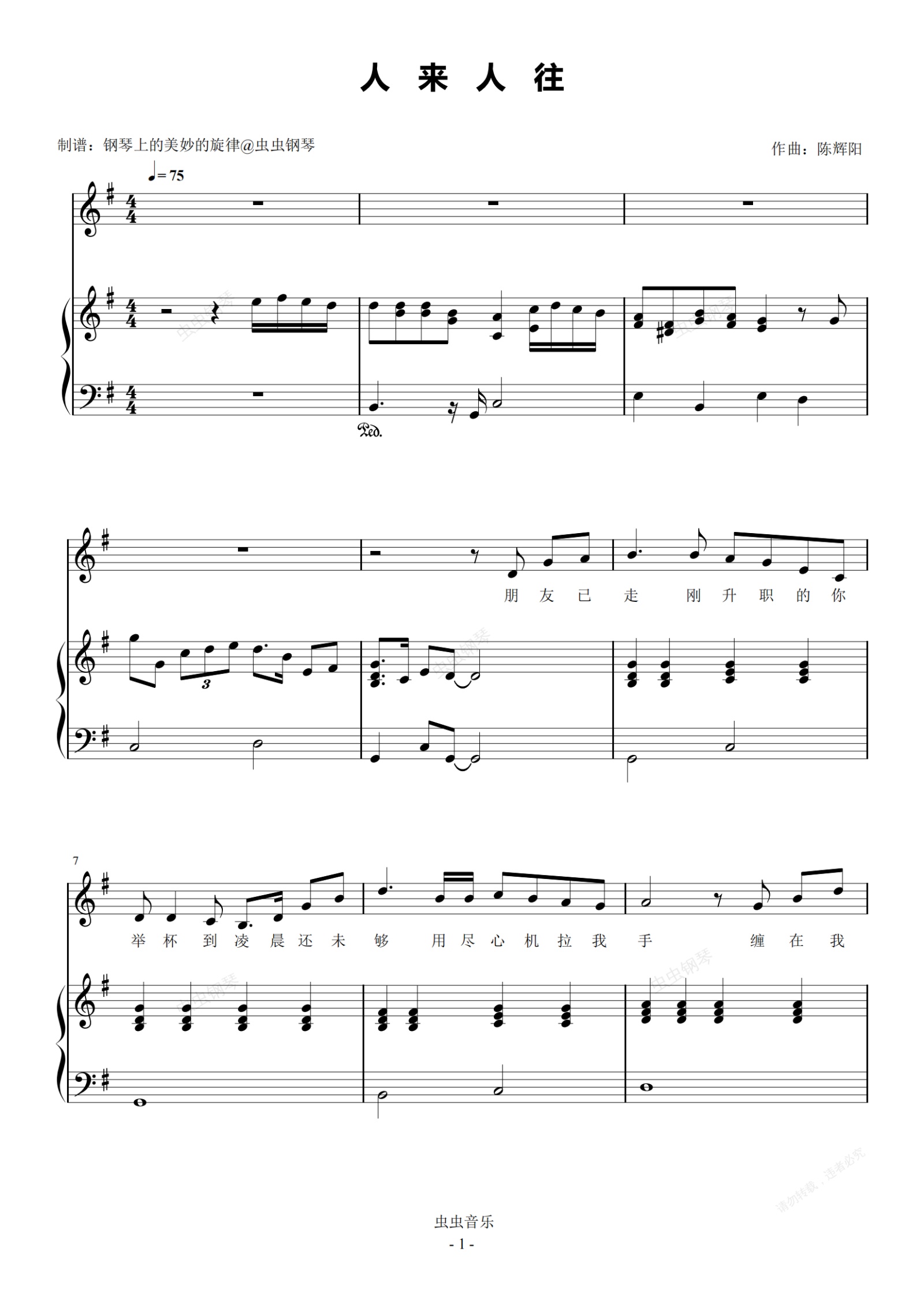 钢琴谱:人来人往 原调简易钢琴弹唱伴奏 带歌词 陈奕迅