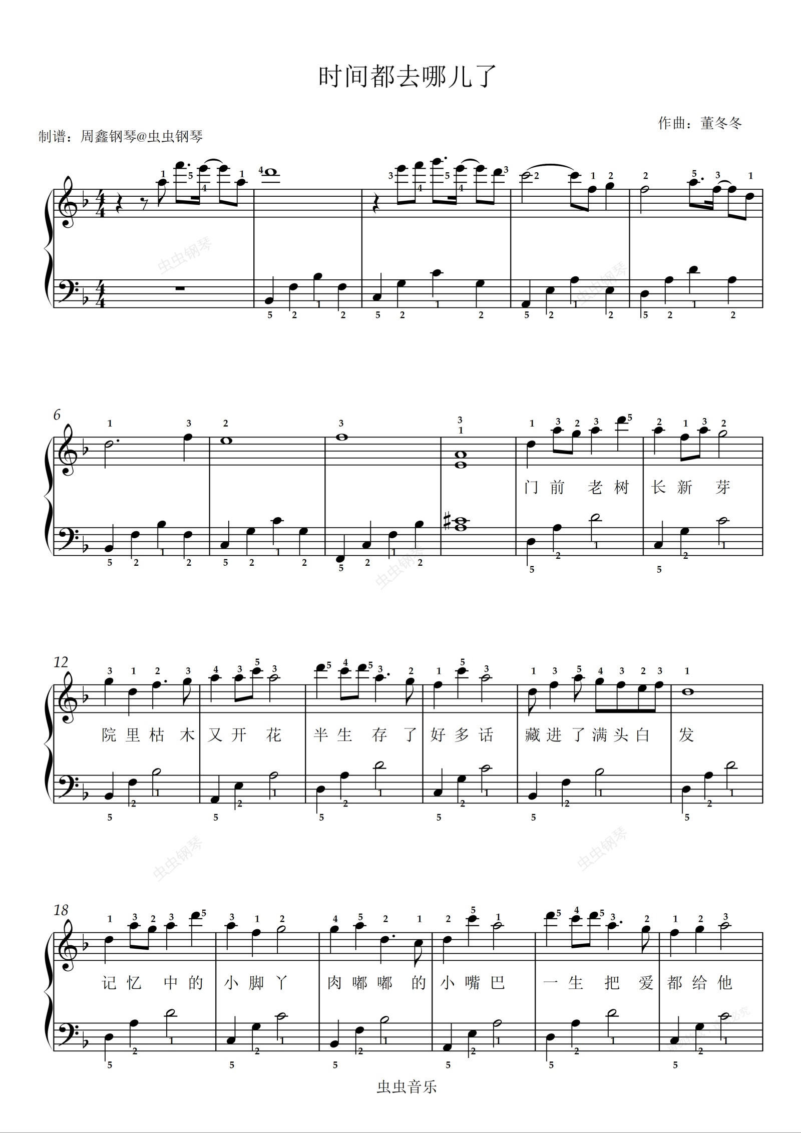 钢琴谱:《时间都去哪儿了》F调 带指法 带歌词 简单版