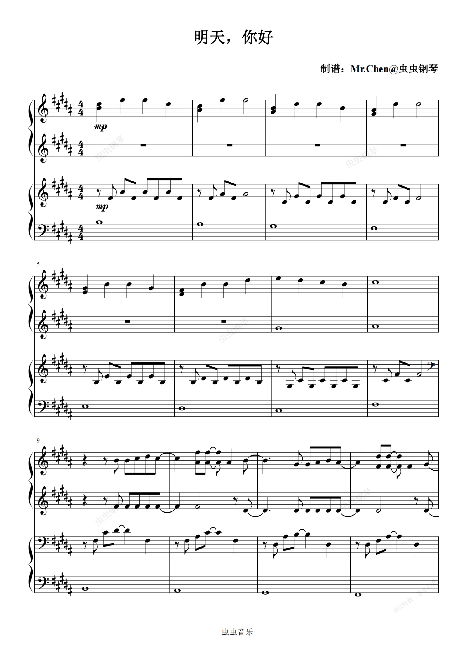 钢琴谱:明天你好 (四手联弹)原调 - 牛奶咖啡