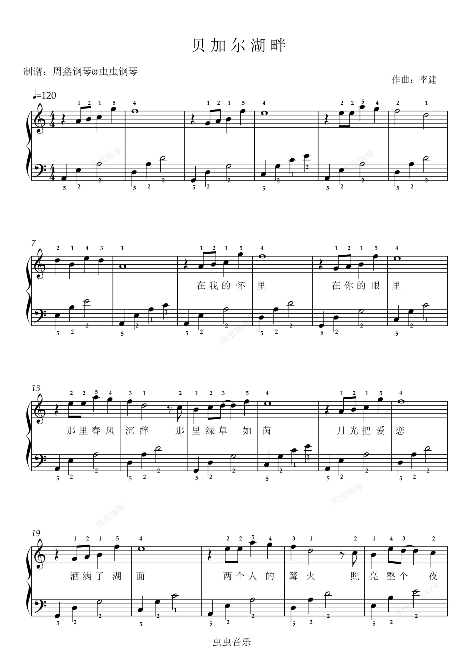 钢琴谱:《贝加尔湖畔》C大调 带指法 带歌词 简单版
