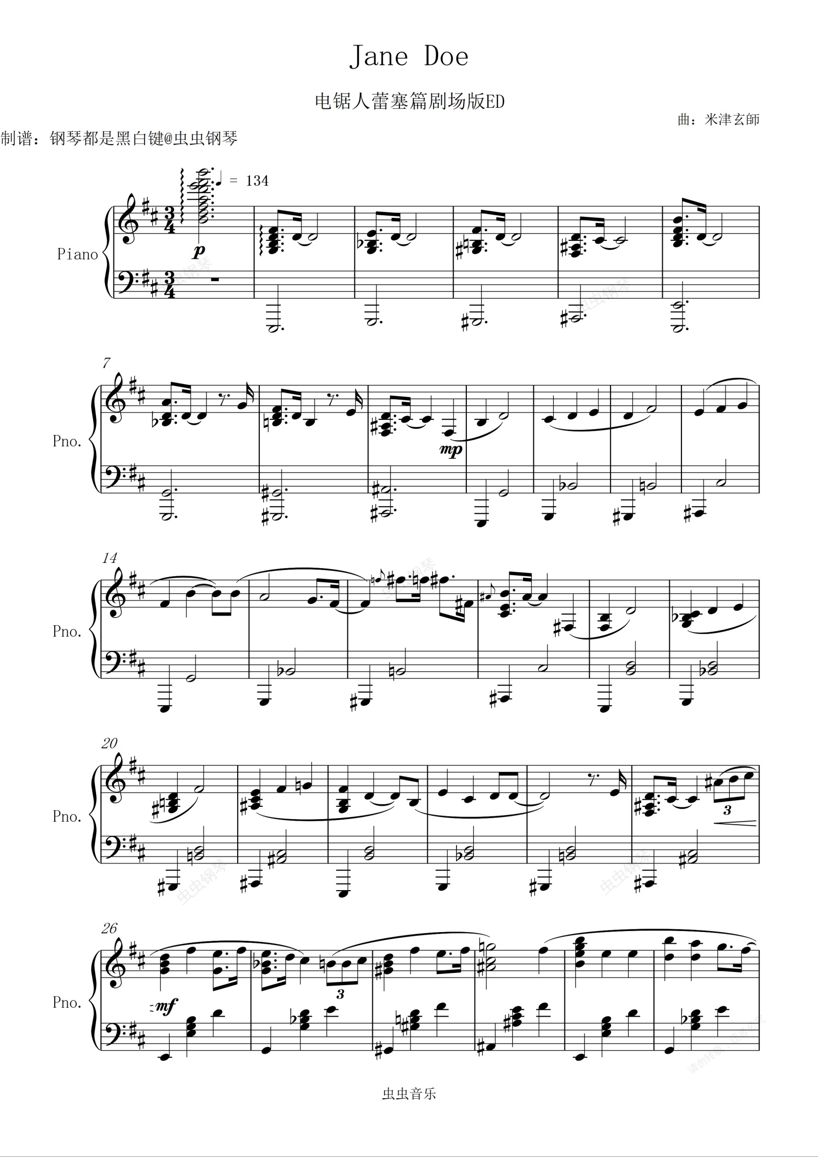 钢琴谱:《电锯人 蕾塞篇》ED「JANE DOE」/ 米津玄師, 宇多田光