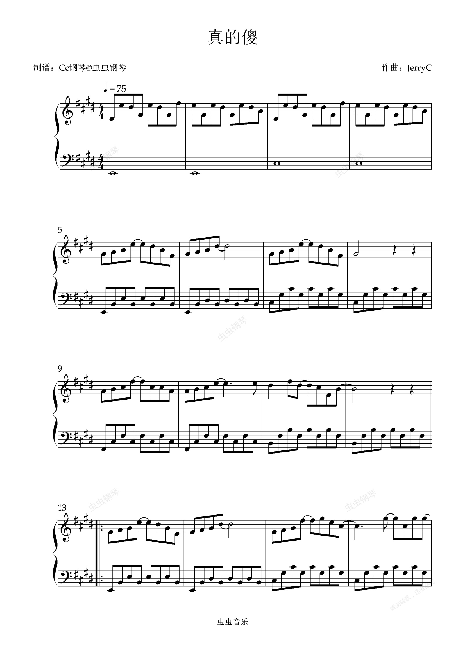 钢琴谱:真的傻 原调 好听易上手