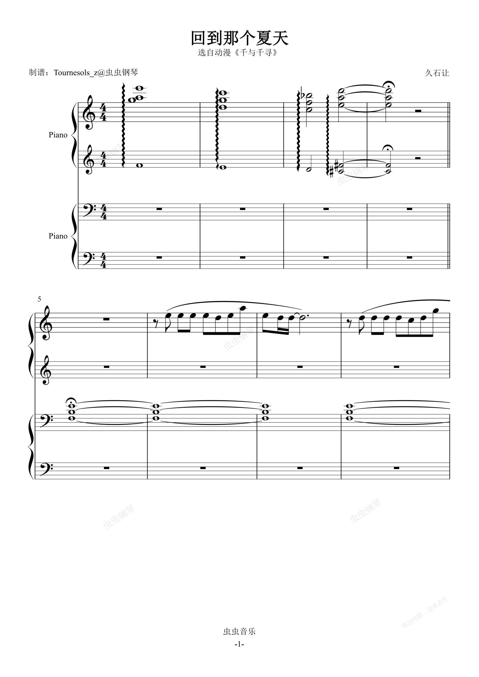 钢琴谱:回到那个夏天(四手联弹,选自动漫《千与千寻》)
