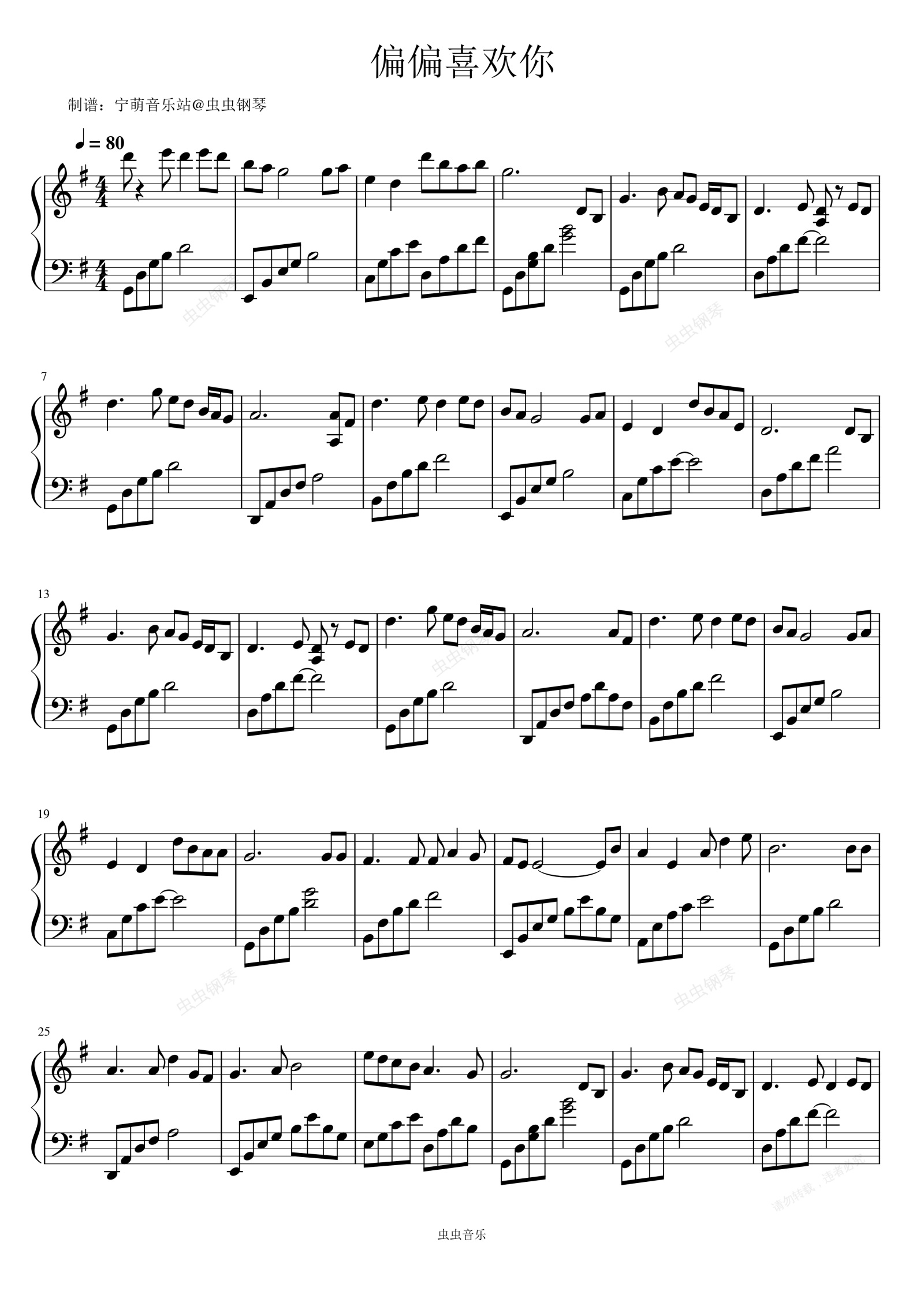 钢琴谱:偏偏喜欢你~陈百强 唯美简单初学者