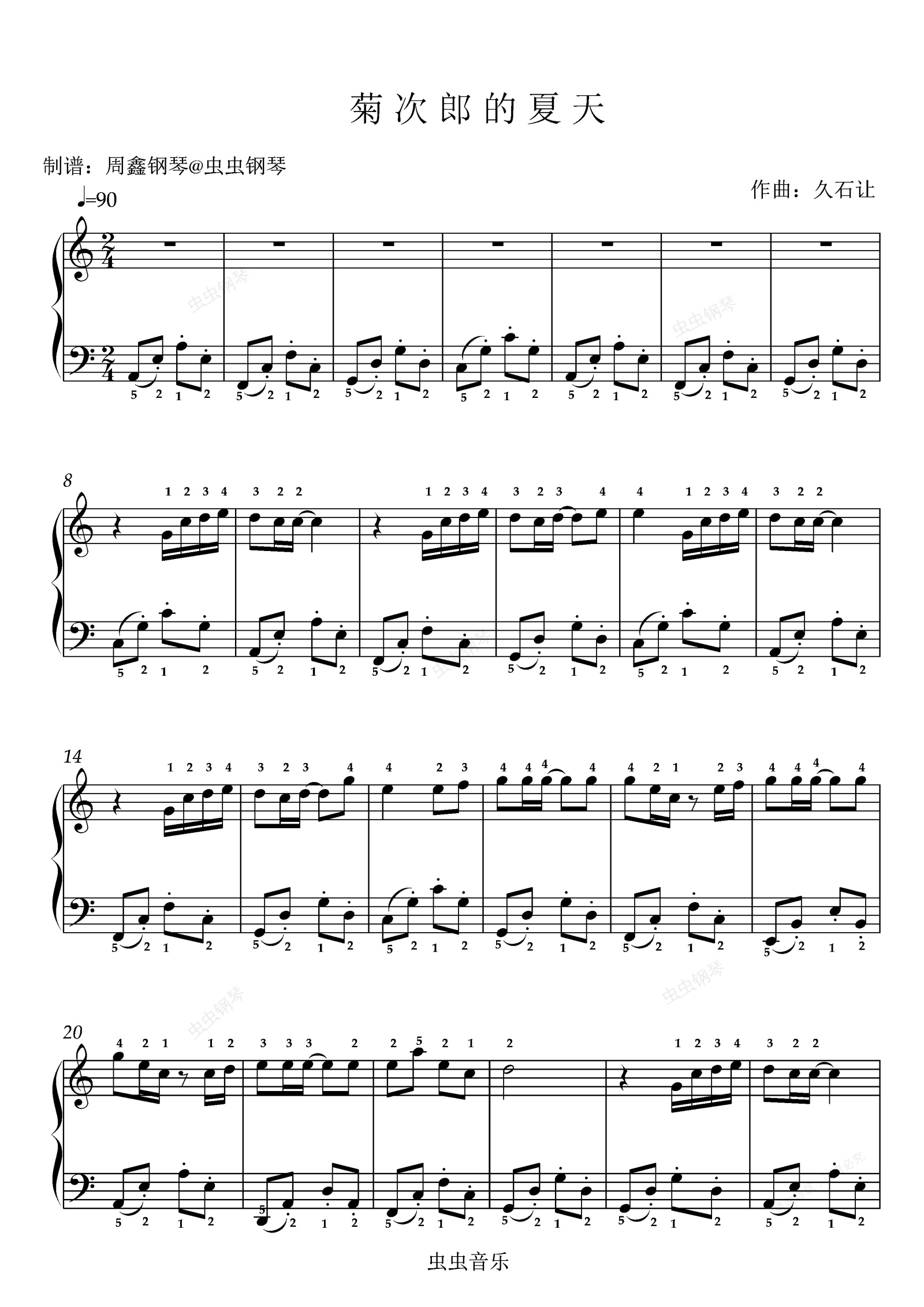 钢琴谱:《菊次郎的夏天》C大调 带指法 简单版
