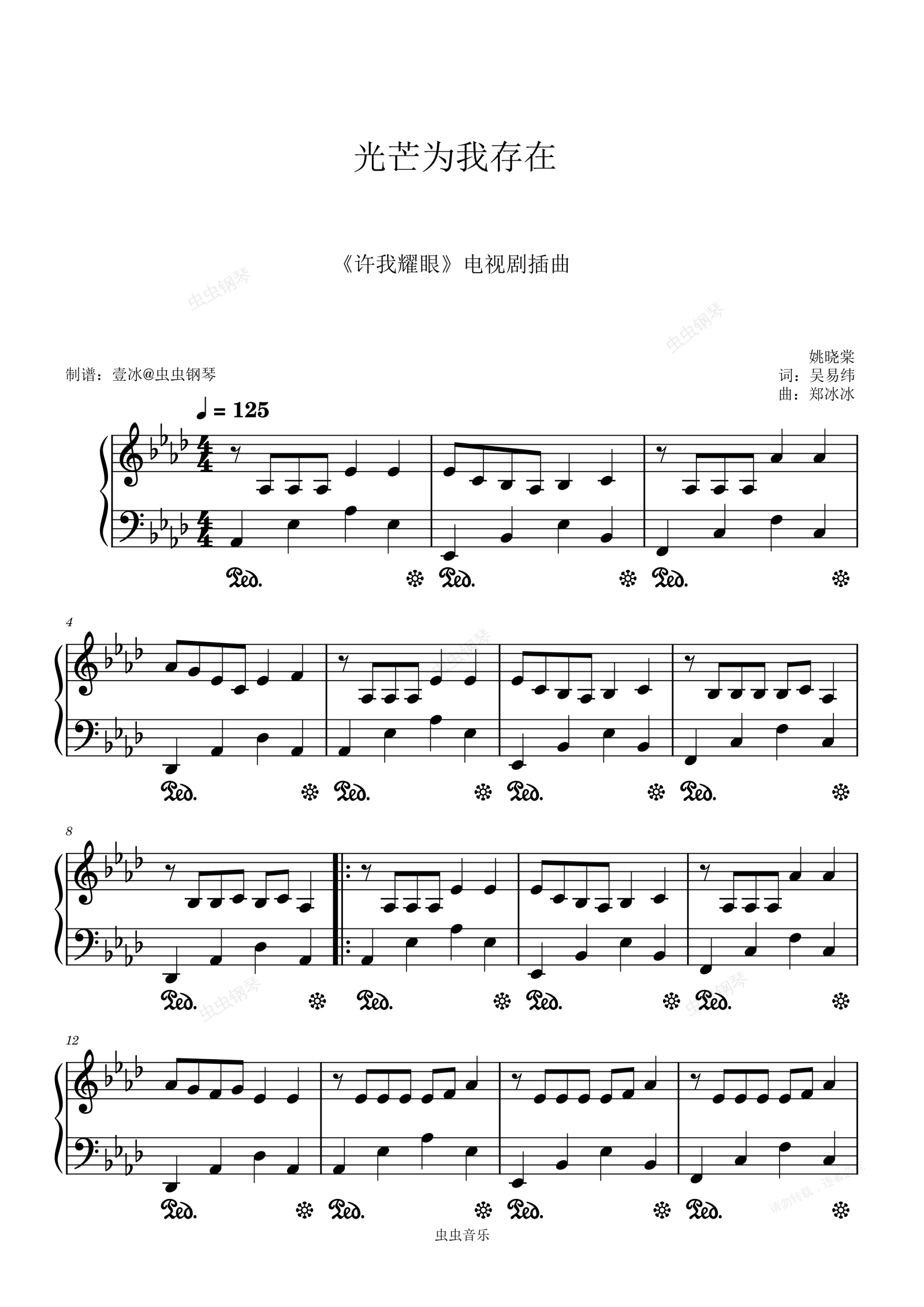 钢琴谱:光芒为我存在 (《许我耀眼》电视剧插曲) - 原调