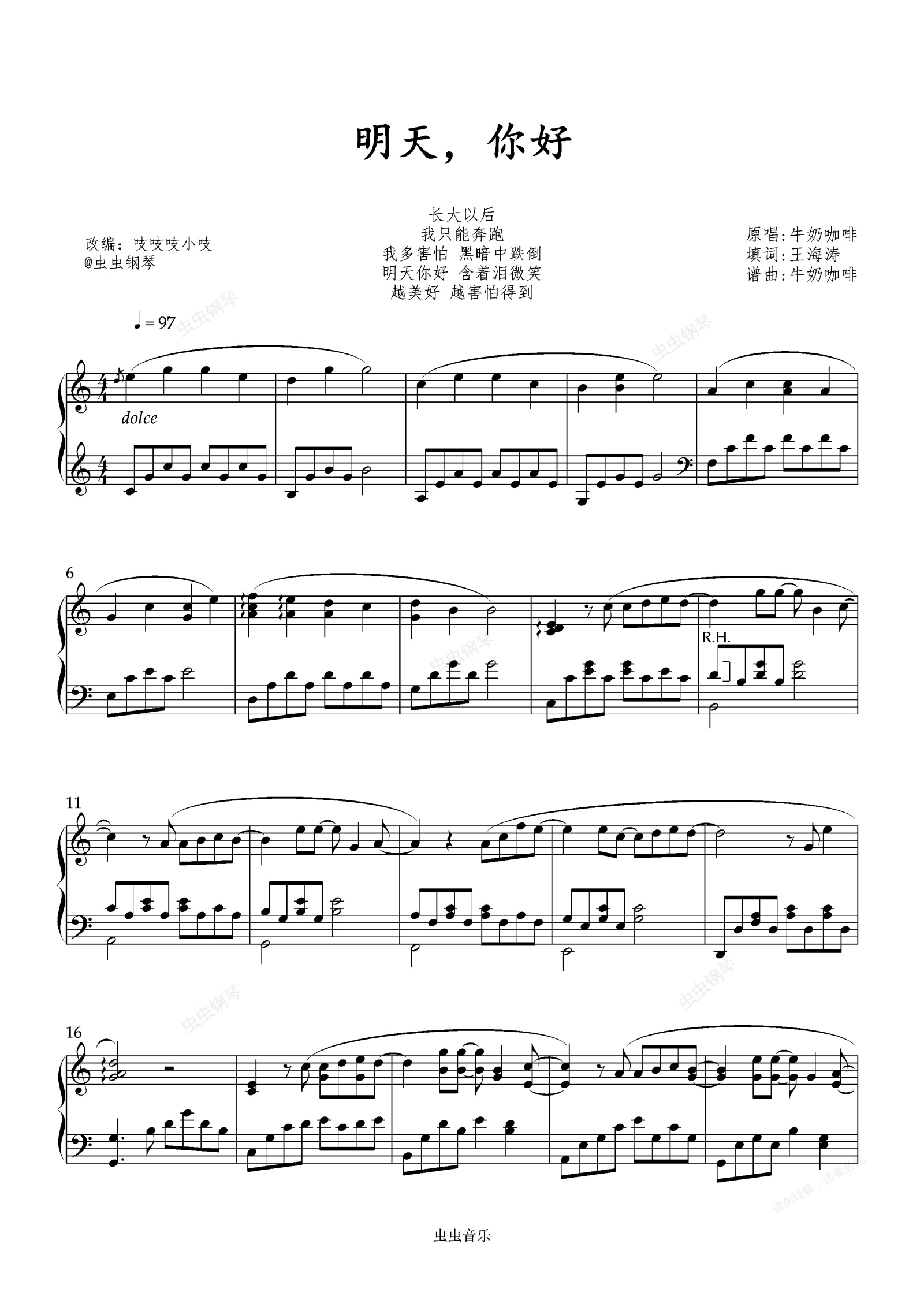 钢琴谱:明天,你好 「励志」牛奶咖啡 C调演奏 吱吱编配