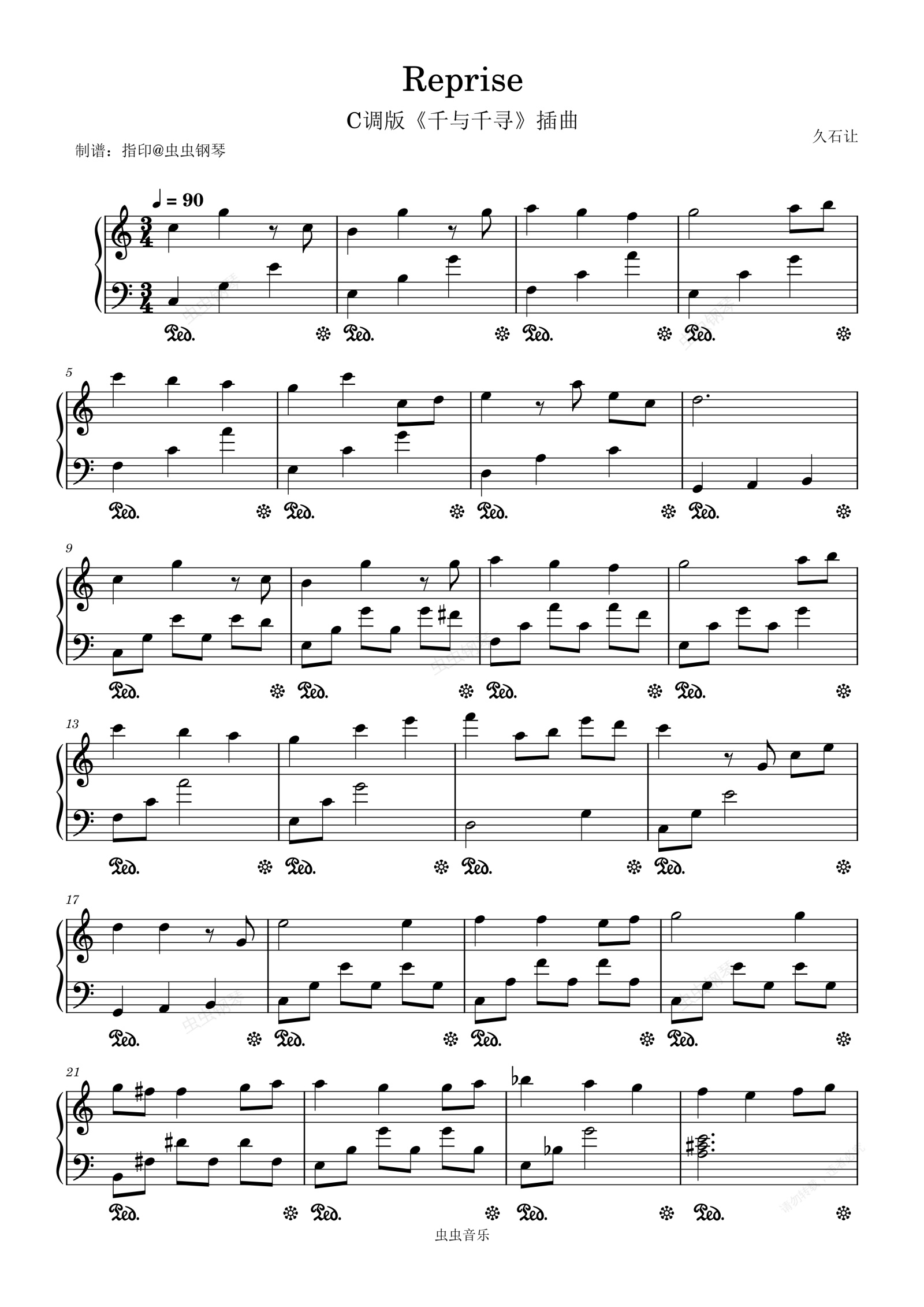 钢琴谱:C调版《Reprise》(千与千寻插曲重新开始)