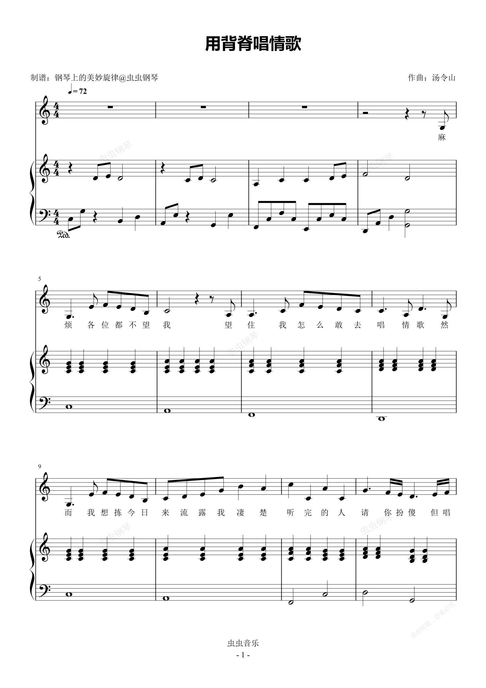 钢琴谱:用背脊唱情歌 C调简易钢琴弹唱伴奏 带歌词