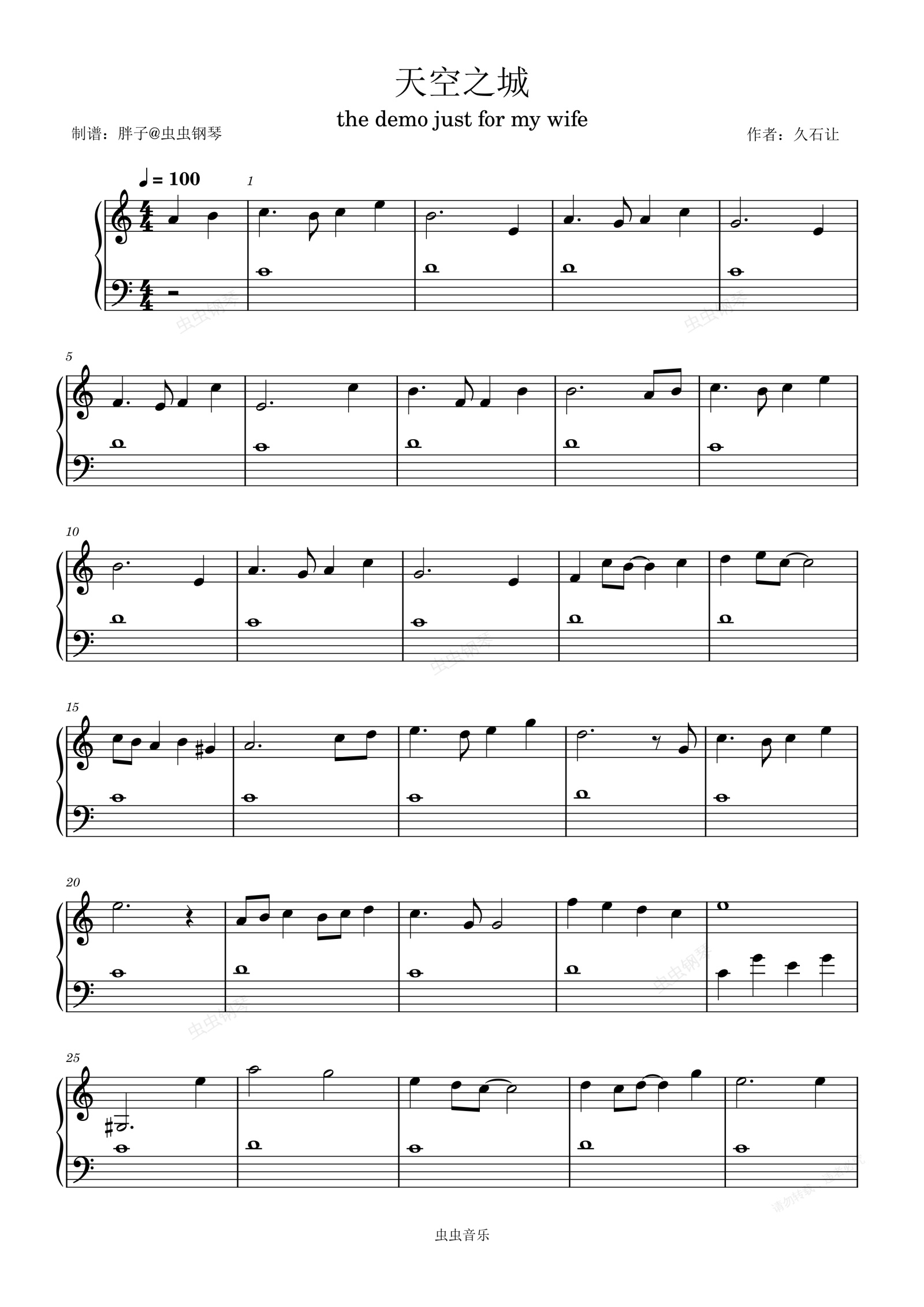 《天空之城》动画片同名主题曲,此版本曲谱极为简单,适合初学者的第一首曲目。最简单的左手伴奏,非常容易。