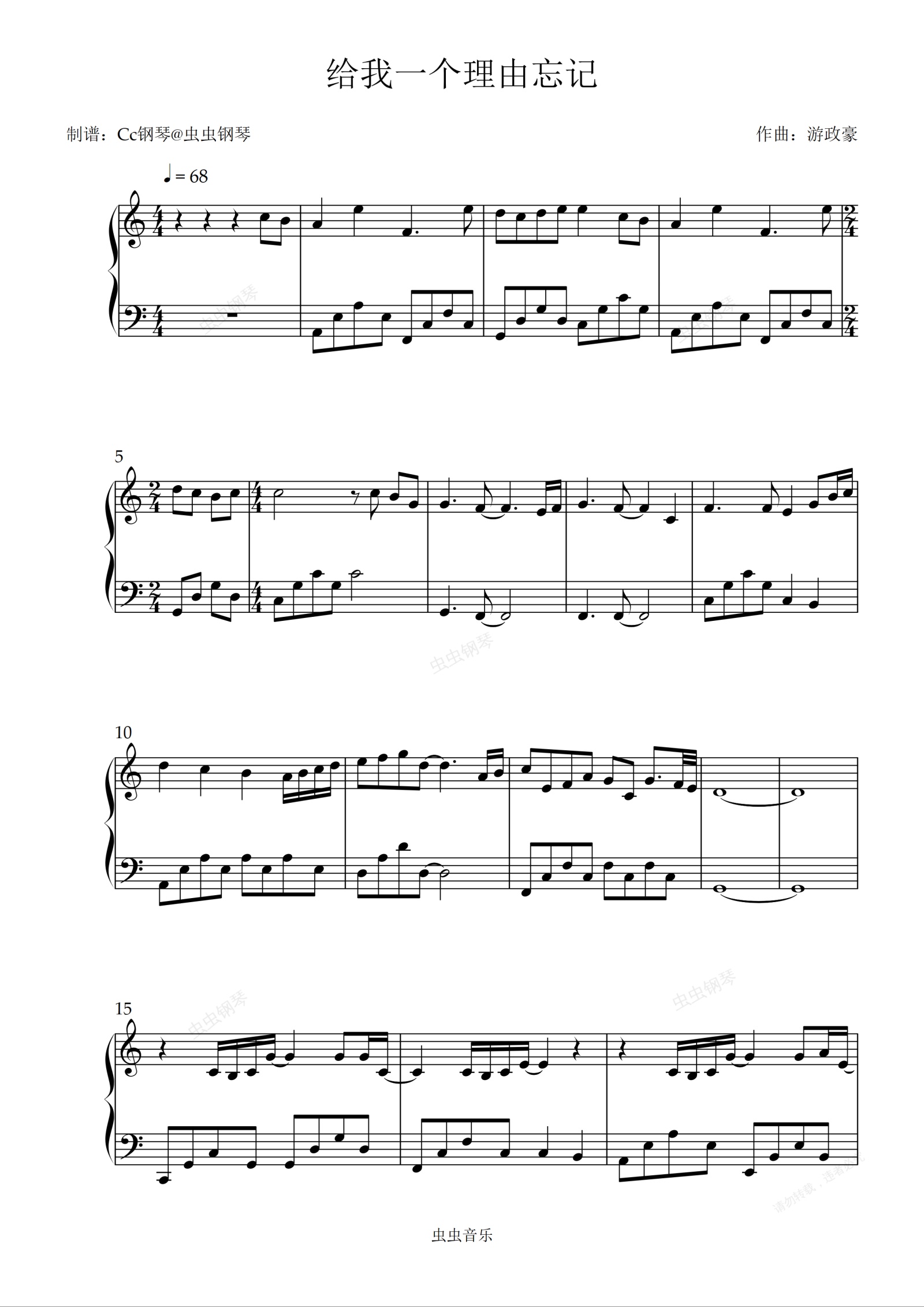 钢琴谱:给我一个理由忘记 C调 好听易上手