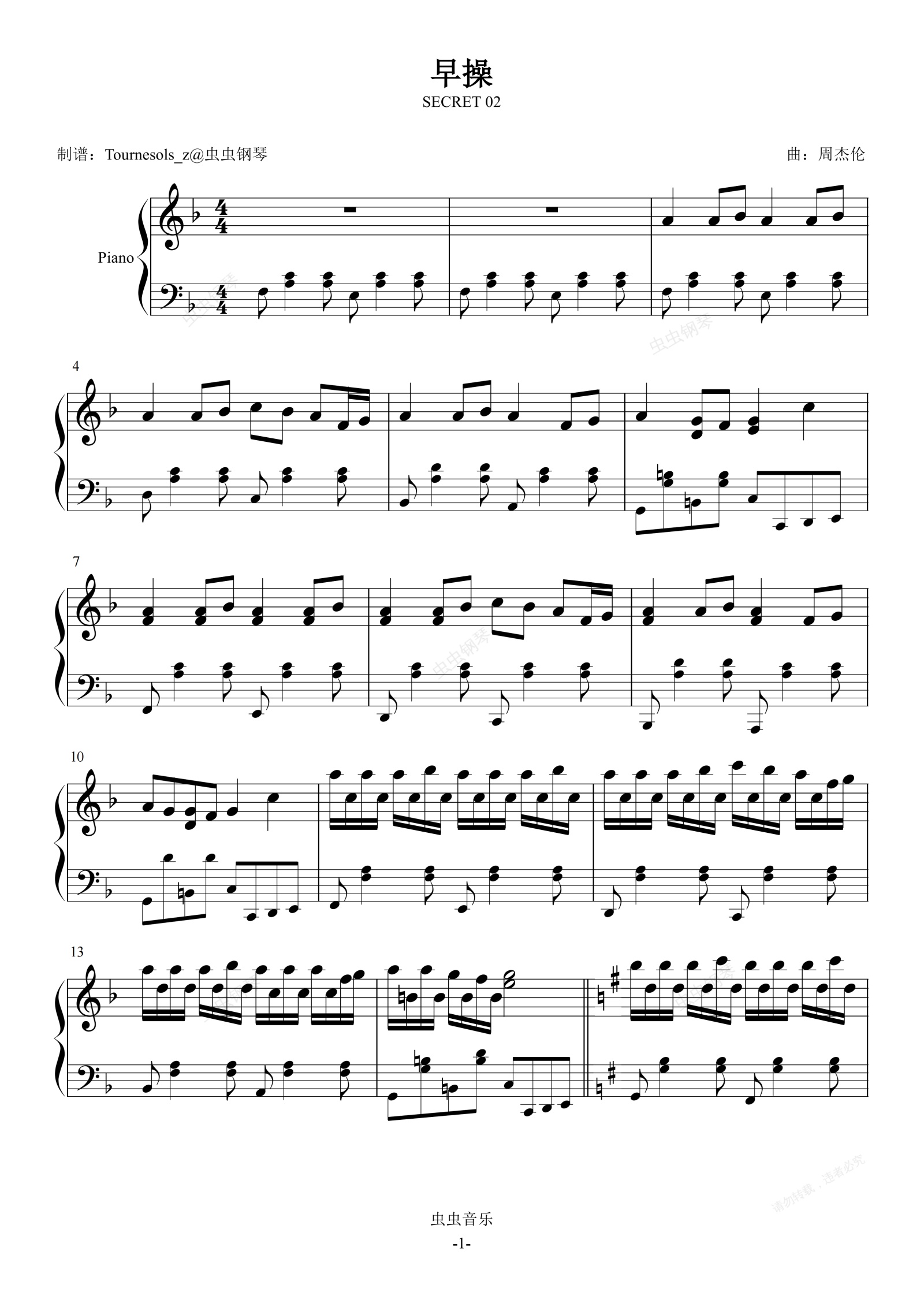 钢琴谱:早操(不能说的秘密)