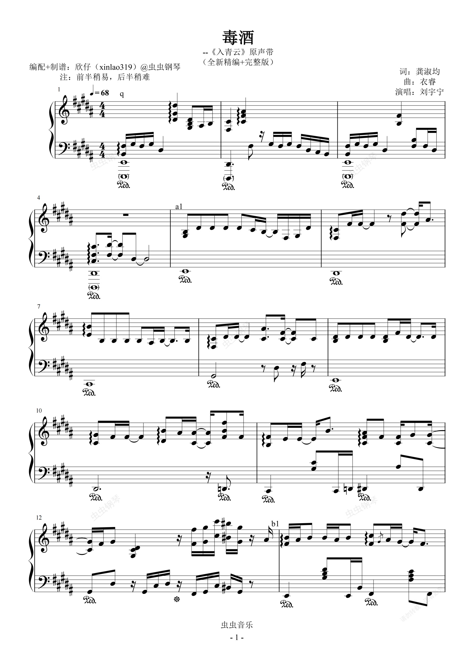 钢琴谱:毒酒(原调升g、刘宇宁《入青云》原声带、完整版)