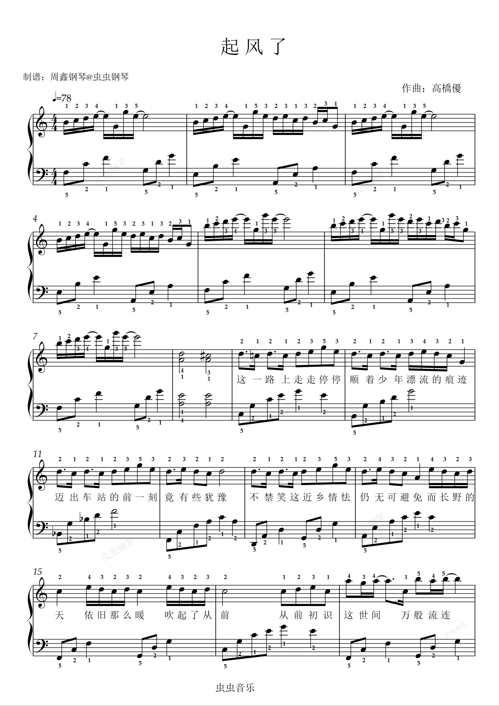 钢琴谱:《起风了》C调 带歌词 带指法 简单版