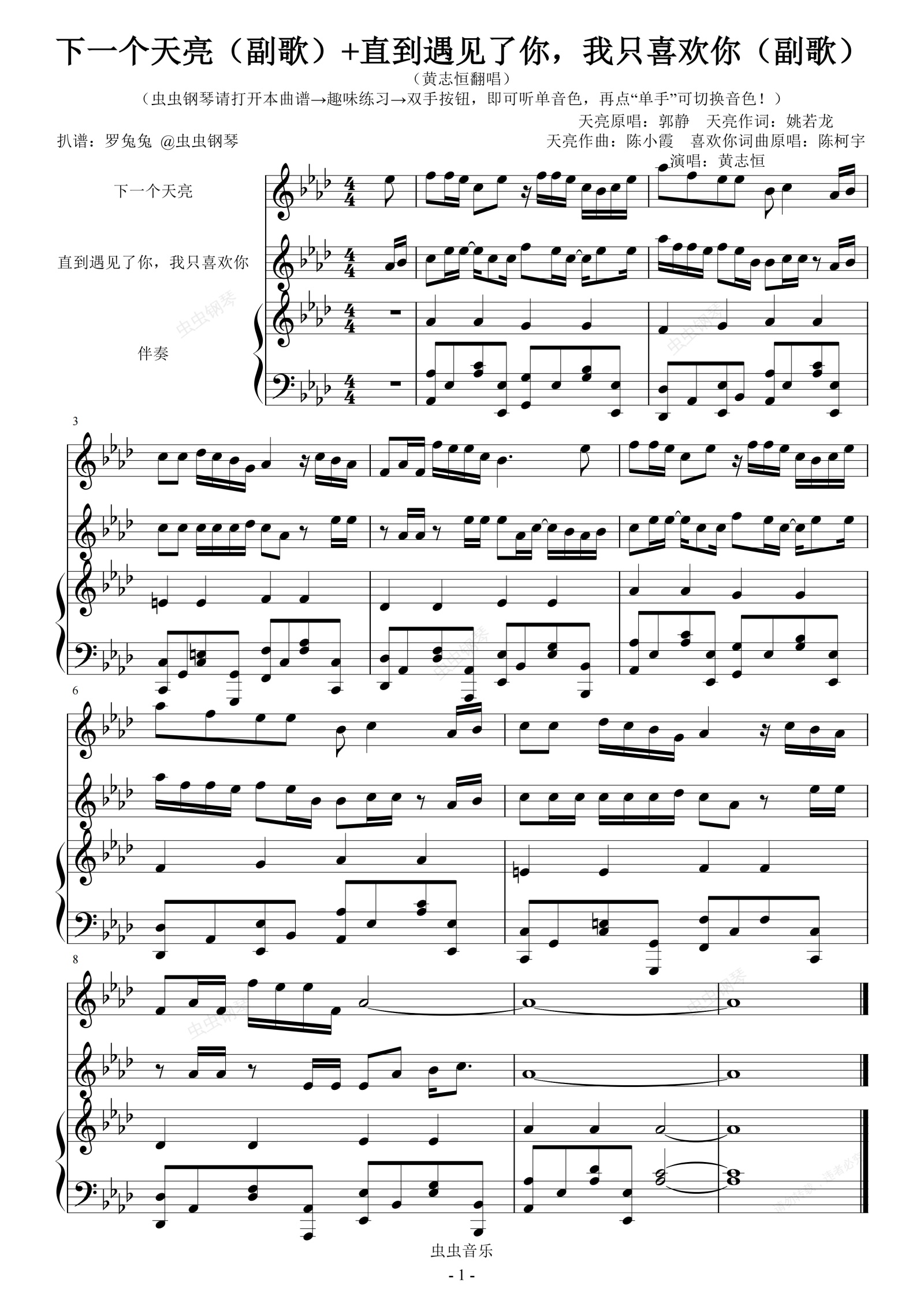 钢琴谱:下一个天亮(副歌)+直到遇见了你,我只喜欢你(副歌)(黄志恒翻唱)