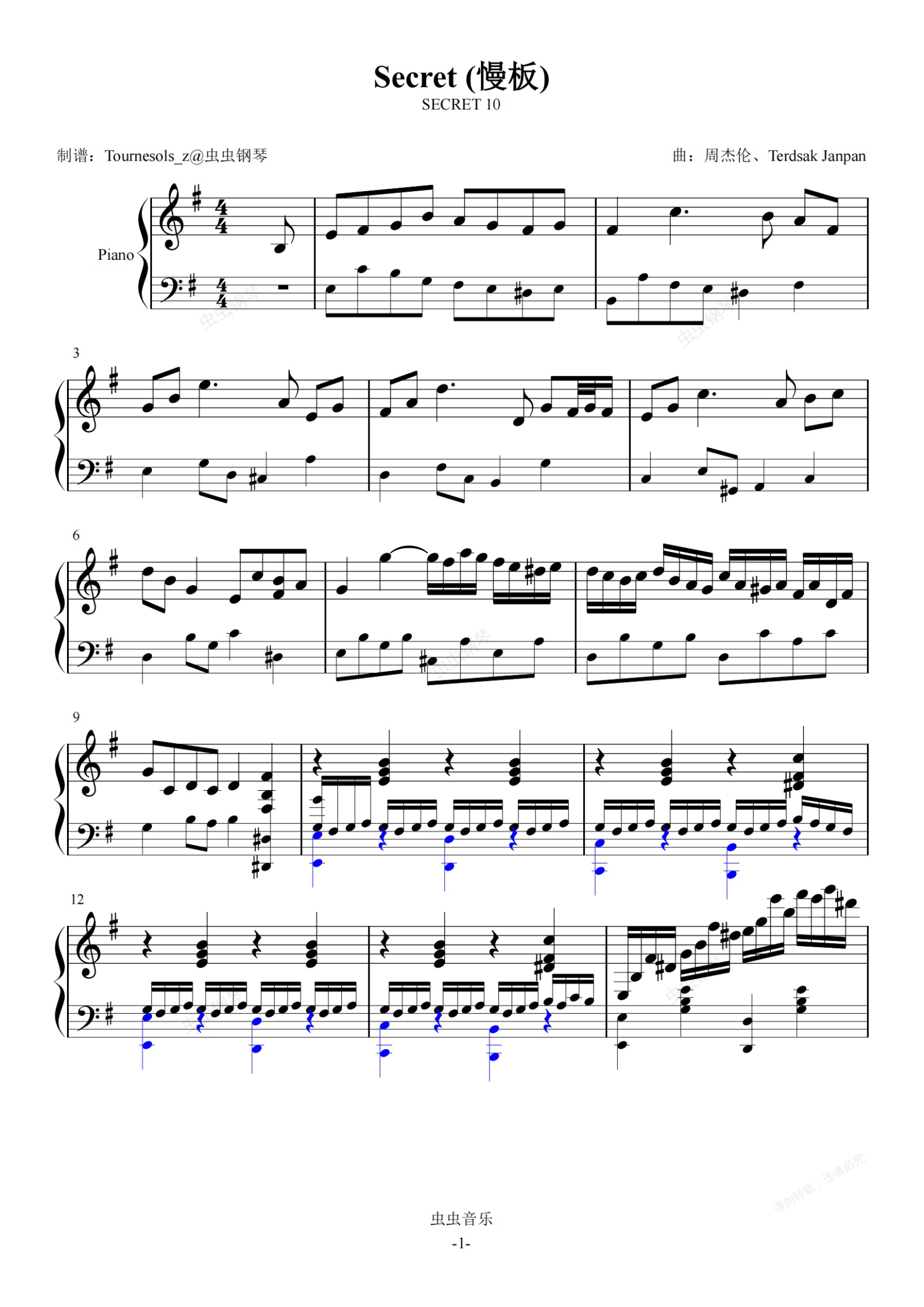 钢琴谱:Secret (慢板) (周杰伦电影《不能说的秘密》写真原谱)