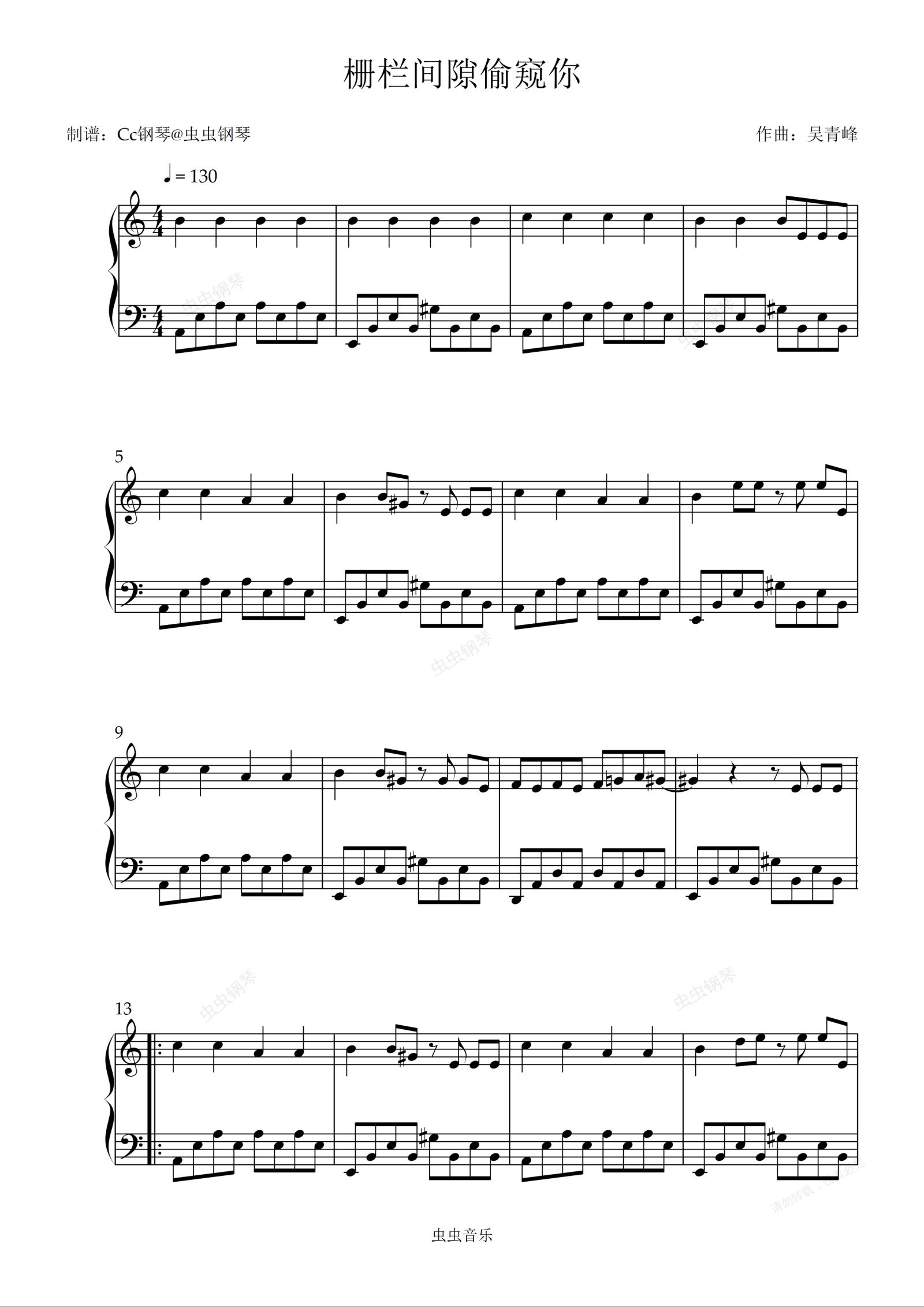 钢琴谱:栅栏间隙偷窥你 C调 好听易上手