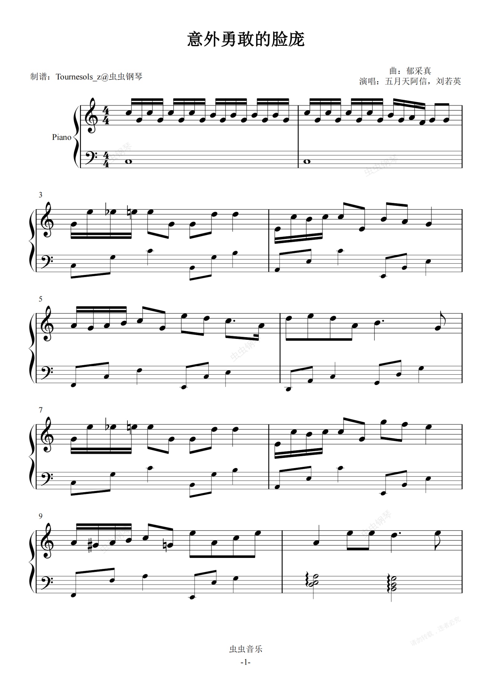 钢琴谱:意外勇敢的脸庞(C调简化版,五月天阿信、刘若英演唱)