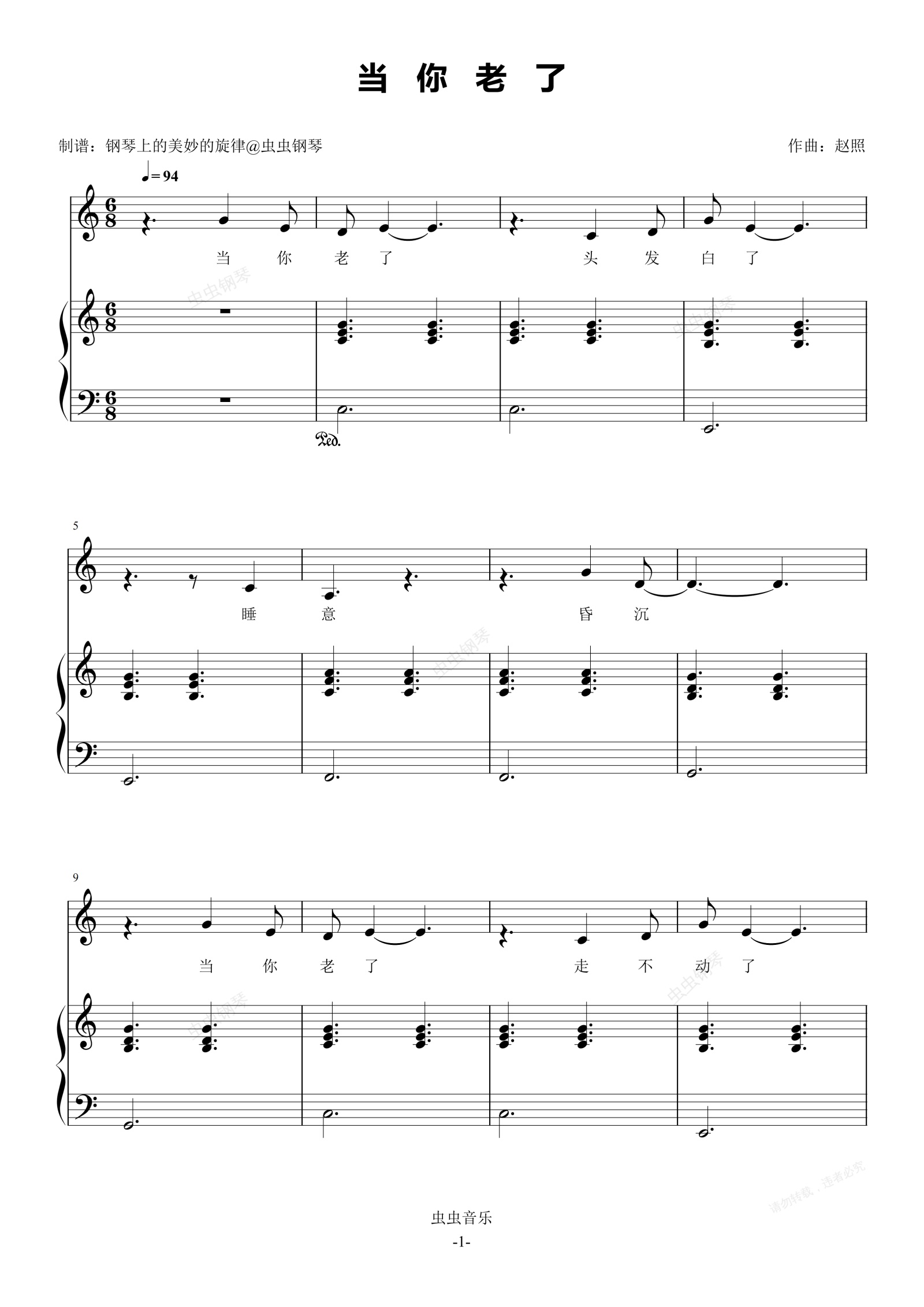 钢琴谱:当你老了 C调简易钢琴弹唱伴奏 带歌词